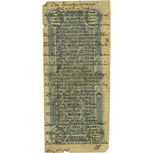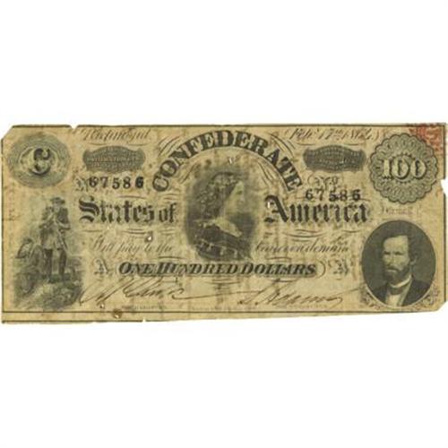 <B>Confederate $100 Bill Inscribed With Post-Surrender Verse.</B></I> “<I>The Unrecorded</B></I>” is the title of a grim 42-line poem by Colonel Henry Fanthorp that is penned on the back of a Confederate note and signed with an "<I>HF</B></I>" monogram dated May 1, 1865. The poem reads in very small part “<I>…Like our dream of hope it passed / Keep it dear friend / 'Til time shall end / For their story will never be told / For a dreary pall / Like a blackened wall / Covers them now all silent and cold.</B></I>” The front of the bill carries a profile portrait of Lucy Pickens, a young woman universally considered the very embodiment of ideal Southern Womanhood. A poignant memento of the “Lost Cause” connected to an important figure in early Texas history. Aging, stains, a small area of marginal loss and one turned corner. Good condition. <BR><BR><b>Shipping:</b> Flat Material, Small (<a target="_blank" href="http://www.heritageauctions.com/common/shipping.php">view shipping information</a>)