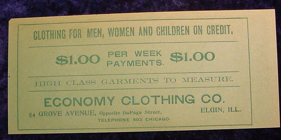 Facsimile Confederate Advertising Note. Economy Clothing Co. Elgin. Illinois.