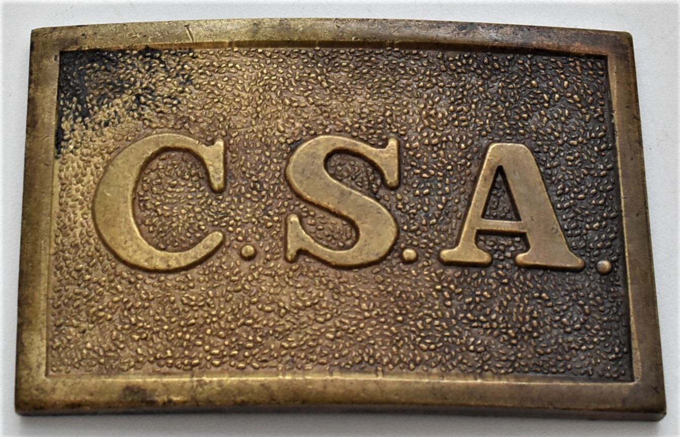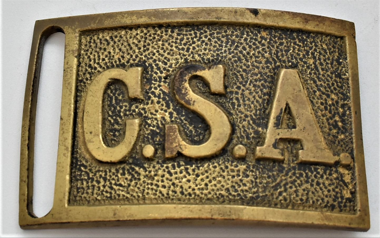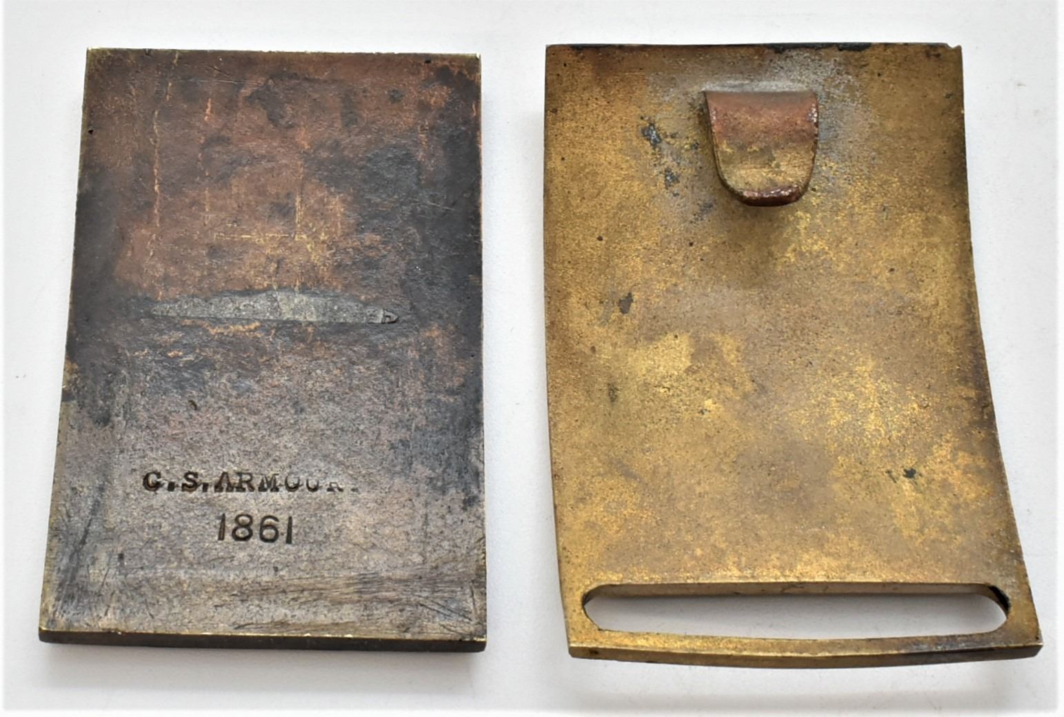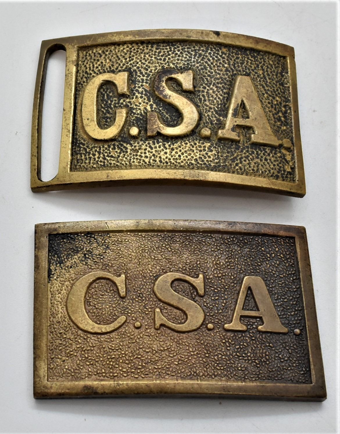 Confederate Army Solid Brass Replica Buckles, includes 1 intact and one missing the back attachments, measure 2'' x 3.5'', one is marked C.S. Armory
