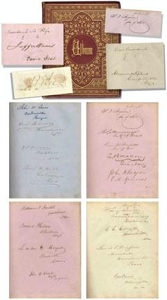 Autograph album containing hundreds of signatures of leaders from the Confederate States of America. Compiled by Florida Confederate Senator A.E. Maxwell and inscribed to his daughter Lizzie, dated 1863. In addition to signatures by 23 Confederate Senators and 73 Representatives, album features the signatures of Jefferson and Varina Davis, Alexander Stephens and Cabinet members Judah P. Benjamin, Christopher Memminger, George Wythe Randolph, Stephen Mallory and John H. Reagan. Also includes clipped signature of General Robert E. Lee. Quarto album is in original purple morocco, with extensive gilt embellishments, including all edges gilt. Entitled ''Album of Beauty,'' published in New York, circa 1855 with five engraved plates and some botanical specimens. In very good condition with some scuffing and shelf wear. Acquired from the great-granddaughter of Confederate Senator August Emmett Maxwell.