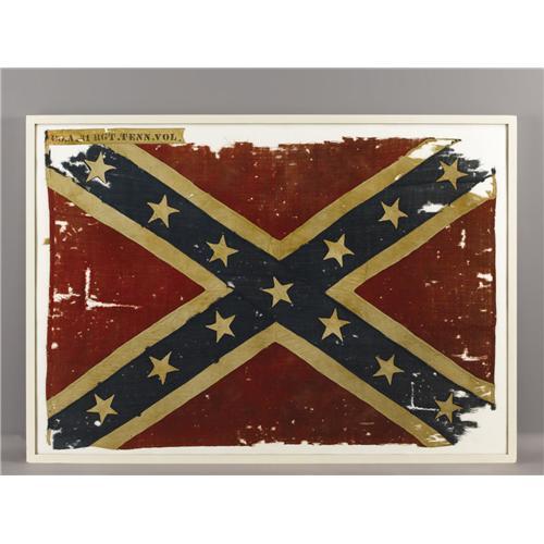 <B>The Confederate Battle Flag of the 31st Tennessee Volunteers, "The Western Stars".</B></I> A Confederate battle flag that was never surrendered or captured is a rare find indeed. This flag is just such a rarity. An Army of Tennessee pattern, it was probably delivered to Company A of the 31st Tennessee Infantry when the regiment wintered in Dalton, Georgia from 1863 to 1864 since this pattern is known to have been issued at the Dalton Depot. Ensign William Bellew daringly carried this flag through every battle until the ill-fated Battle of Nashville in December 1864 where he was captured by federal troops. Bellew stripped the flag from its staff before the Union forces could take it from him, concealing it inside his coat under the cover of darkness. Taken to Camp Chase, Ohio as a prisoner of war, he quickly quilted the flag into the lining of his coat. Released in June 1865, he returned home to Gibson County, Tennessee with the flag still secretly sewn inside his coat. <BR><BR>Bellew's mother is responsible for the flag being transferred out of the family's hands. When Dr. George W. Nowlin, a medical doctor who had been the hospital steward of the 31st during the war found out that Mrs. Bellew had been flying the flag in her garden to scare off marauding birds, he sent for the flag to keep it secure. The flag has descended to its present owner through the Nowlin family. <BR><BR>Measuring 35" on the staff and 51" on its fly, the flag is made of hand-sewn red wool traversed by a 5.25" wide dark blue bunting St. Andrew's cross edged on each side with a 2" wide strip of white cotton. The cross bears thirteen white cotton 3.25" diameter five-pointed stars set at 8" intervals from the center star. Accompanying the flag is a 24" cotton strip stenciled with the words "Co. A 31 Reg. Tenn. Vol.". <BR><BR>Company A, called the 'Western Stars' of the 31st Tennessee regiment of the Confederate Infantry was formed out of Weakley County, Tennessee and organized with the regiment in Gibson County at Camp Trenton in September 1861. Under the command of General J. P. McCown, the regiment moved to Columbus, Kentucky and on to Fort Pillow and by April 1862 was in Corinth, Mississippi. Passing through Tupelo and Chattanooga, the regiment saw action at the Battle of Perryville where it lost 100 men. A contemporary account by a Federal soldier at the battle stated that the 31st Tennessee attacked "with death-defying steadiness, uttering wild yells until staggered by the sweeping crossfire of our artillery..." And the regiment would suffer for their bravery, the casualties only multiplying throughout the rest of the war; 250 at Chickamauga, 300 at Franklin in one day, 600 dead within fifty yards of them. Just two weeks later William Bellew would carry the same flag that he waved in these actions into the Battle of Nashville. His quick thinking on the battlefield combined with the wisdom of Dr. Nowlin and his descendants have preserved this unique treasure from the Civil War. <BR><BR>Noted conservator Fonda Thompson has framed the flag with archival quality which comes with the accompanying research volume. Renowned author and Civil War expert Howard Madaus has authenticated the flag and a copy of his research is provided as well. A 500-page leather bound volume along with a photograph album tracing the 31st and their path during the war is included with the banner, documenting the history of the regiment and the flag. This historic flag has been the subject of much press coverage and is used in many academic texts as an example of rare Civil War flags, unique in every way.<BR><BR><b>Shipping:</b> Small Collectibles (<a target="_blank" href="http://www.heritageauctions.com/common/shipping.php">view shipping information</a>)