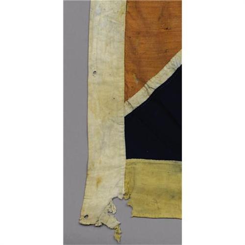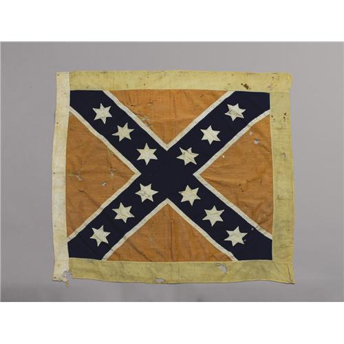 <B>The Confederate Battle Flag of the 4th Tennessee Infantry: The Famous Beauregard Design.</B></I> This "artillery"-sized Confederate battle flag was the product of intense lobbying by General Pierre Gustave Toutant Beauregard. Realizing that the states were not supplying flags for their troops and being determined to end the confusion of identifying friend from foe on the battlefield, Beauregard lobbied the Confederate Congress to adopt a more distinctive flag for the Southern forces. After failing in that effort, Beauregard solicited design concepts from his commanders. The result was the design shown here which became the prototype of the Confederate battle flag used at the Battle of Shiloh; it is remarkably intact and only one of two known to exist. Descended through the unit's last commander, the flag of the 4th Tennessee Infantry was manufactured by the noted New Orleans contractor Henry Cassidy and delivered to the regiment in April 1862. It is one of two flags proudly displayed by Confederate veterans at a Shiloh reunion in 1900 in the photograph below. <BR><BR>Cassidy constructed the flag's field using a red cotton-wool fabric warp/weft. Emblazoned on the field is the dramatic, fine blue 5.5" wide St. Andrew's cross bordered by strips of white cotton. On the obverse, twelve white, six-pointed silk stars are sewn at 4.5" intervals. Reverse, the blue fabric is cut away to reveal the twelve stars at 2.75" to 3" across from point to point. A yellow 3.25" twill weave serge border is sewn to the three exposed sides of the flag. A 2.125" wide cotton heading contains the five buttonhole eyelets that finish the staff side of the flag. The overall dimensions are 35.5" on the staff side and 37" on the fly. Accompanying the flag, once attached, is a white cotton swallowtail streamer measuring 8" at the hoist and 44.5" to the tip of the streamer's points (40" to the cut of the swallowtail). Also shown in the 1900 photograph below, the streamer bears the inscription "4th Tenn. Inf." in block letters. The flag is in overall good condition with some moth damage to the red field. The silk stars show only minor wear while the blue St. Andrew's cross is still brilliant with minimal wear. Moth damage appears at the serge border while the numeral "4" in the streamer has loss due to paint deterioration. <BR><BR>The most recognizable banner of the Confederacy, the design originally called for flags of different sizes to be issued to the infantry, cavalry and artillery. However, in practice, the flags were issued to units based on availability with no regard to protocol. And the 4th Tennessee would need them. Organized near Memphis at Germantown, Tennessee, it was accepted into Confederate service on August 16, 1861. In just over six months the regiment would lose almost half of its effective forces at the Battle of Shiloh with Brigadier General Charles Clark's Division. While Colonel Rufus P. Neely would be commended for his bravery at Shiloh, the casualties included the regiment's Major, John F. Henry. However, Colonel Neely would die soon thereafter in May 1862. After the siege at Corinth and the Battle of Perryville, the regiment was so decimated by the time of the Battle of Murfreesboro that it was consolidated with the 5th Tennessee to form the 4th/5th Tennessee Regiments. Forming the right wing of Stewart's Brigade, the regiment was honored in their capture of many federal pieces during the battle. Chickamauga, Missionary Ridge, Atlanta and Jonesboro, Georgia would follow. By the time of their surrender at Greensboro, North Carolina on April 26, 1865, the few men shown here left standing and holding this same flag they fought under so many years earlier were lucky to be alive. <BR><BR>Letters of authenticity and research from renowned Civil War flag expert and author Howard Madaus are included.<BR><BR><b>Shipping:</b> Small Collectibles (<a target="_blank" href="http://www.heritageauctions.com/common/shipping.php">view shipping information</a>)