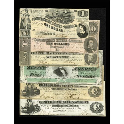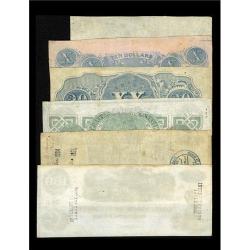 <B>Confederate Brigade.</B></I><BR><B>T39 $100 1862 (2) Fine; CU</B></I><BR><B>T44 $1 1862 Fine-VF</B></I><BR><B>T52 $10 1862 Fine</B></I><BR><B>T57 $50 1863 XF-AU, CC</B></I><BR><B>T58 $20 VF+.</B></I>