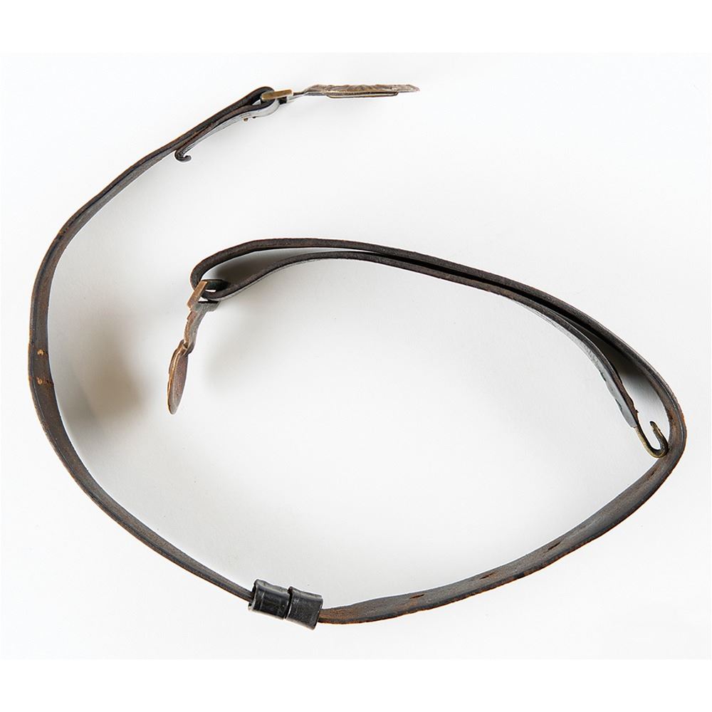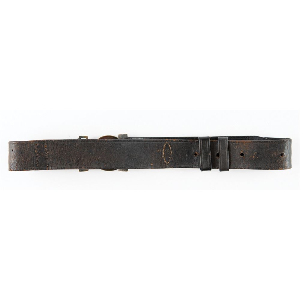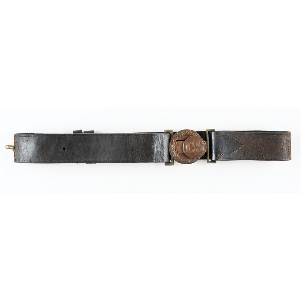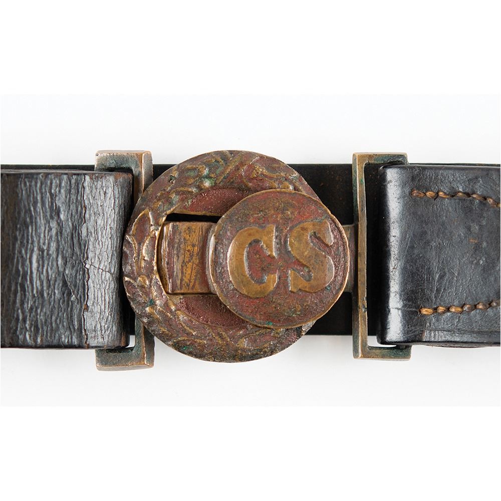 Civil War-era Confederate belt with an original, two-piece, circular "CS" and wreath clasp measuring 1 13/16" in diameter. The brass has developed a dull ruddy-ochre patina with a darker shade on the stippled background, as well as some visible grind marks on and around the attachment loops. The plate is attached to an original leather waist belt that measures 29" long (as adjusted) and 1 1/2" in width. The dark brown bridle leather has some heavily flaked areas with numerous scuffs and blemishes, but is still intact and quite supple for its age. Some residual stitching is present about 6" back from the wreath portion of the clasp.