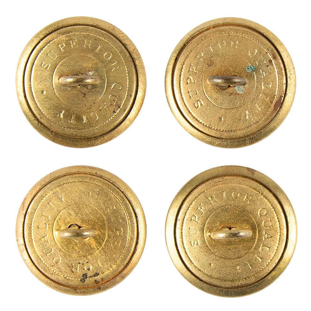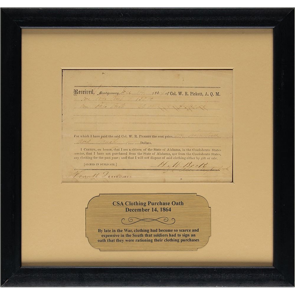 This grouping has four non-dug, two-piece "CSA" brass buttons measuring just under 7/8" in diameter. Three of the buttons are in unissued condition and have bright yellow brass, while the fourth exhibits some mild surface oxidation across the domed portion. All of the buttons are marked, "SUPERIOR QUALITY," on the reverse. Also included is a December 14, 1864 dated uniform receipt for $190 to an H.M. Beck serving in an Alabama regiment. The ink has faded, making some of the writing difficult to read, however the paper is in very good to fine condition, with some age toning. The slip is housed in a modern double-sided frame that measures 13" x 12 1/4". These items are further encased in a 14 1/4" x 20 1/4" Riker box.