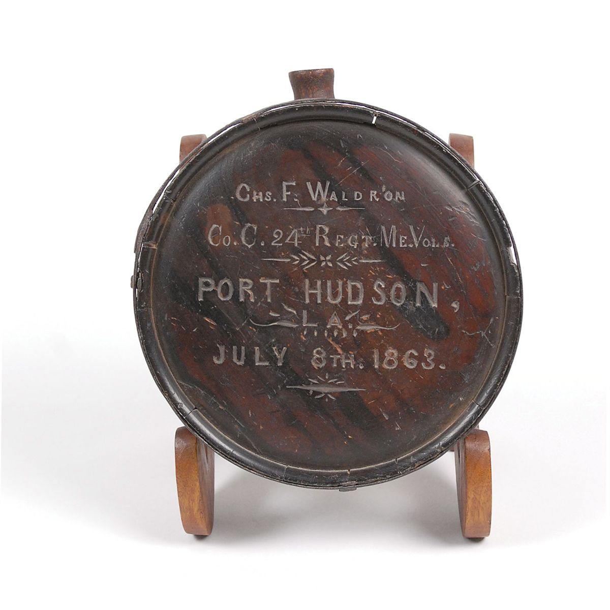 This is a classic style drum canteen with wooden staves bound by strap iron bands. The canteen is 7.5? in diameter and 2.25? thick with a separately carved wood spout. We do not know the type of wood, but the color is great with the sides being a dark reddish-brown with some black striping. One side has a 2.25? crack at the edge that is tight with no missing wood. The iron straps have a dark patina with even light pitting and one of the three retaining loops for a carry strap is missing. One side of the canteen is neatly carved "CHS. F. WALDRON / CO. C. 24TH REGT. ME. VOLS / PORT HUDSON, / L.A. / JULY 8TH, 1863." Included information from internet databases indicates that Charles F. Waldron of Canaan, Maine, was 20 years old when he enlisted as a sergeant in 'C' Co., 24th Maine Infantry, on October 13, 1862. This was a nine-month regiment that served in Louisiana. The regiment participated in the entire siege of the Confederate stronghold at Port Hudson during May and June of 1863. Battle casualties were almost nil, however 190 officers and men died of disease in the few short months they were in the south. The regiment left Port Hudson on July 24, 1863 (only a few days after the inscription on this canteen, perhaps accounting for the wonderful condition, as Sergeant Waldron took it directly home). The regiment arrived in Augusta, Maine, on August 6 and mustered out of service on August 25, 1863. A custom wood display stand is included. An excellent addition to any Civil War collection.