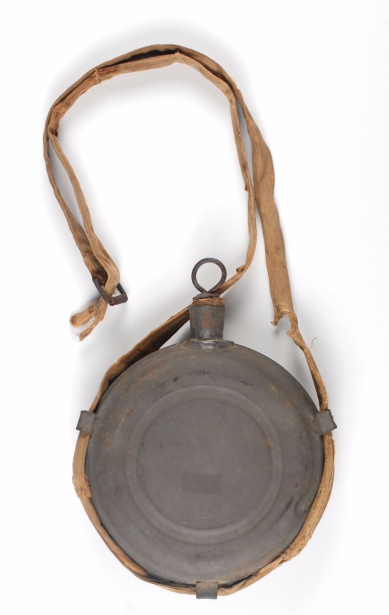 Confederate tin canteen with an impressed circular design on both sides, measuring approximately 6.5? in diameter and 2.5? thick, attached to its original cotton cloth carrying strap with iron buckle. The canteen is designed with soldered seams and spout and retains its original cork and metal stopper. Scattered small dings and soiling, and various stains and tears to the strap, otherwise fine condition.
