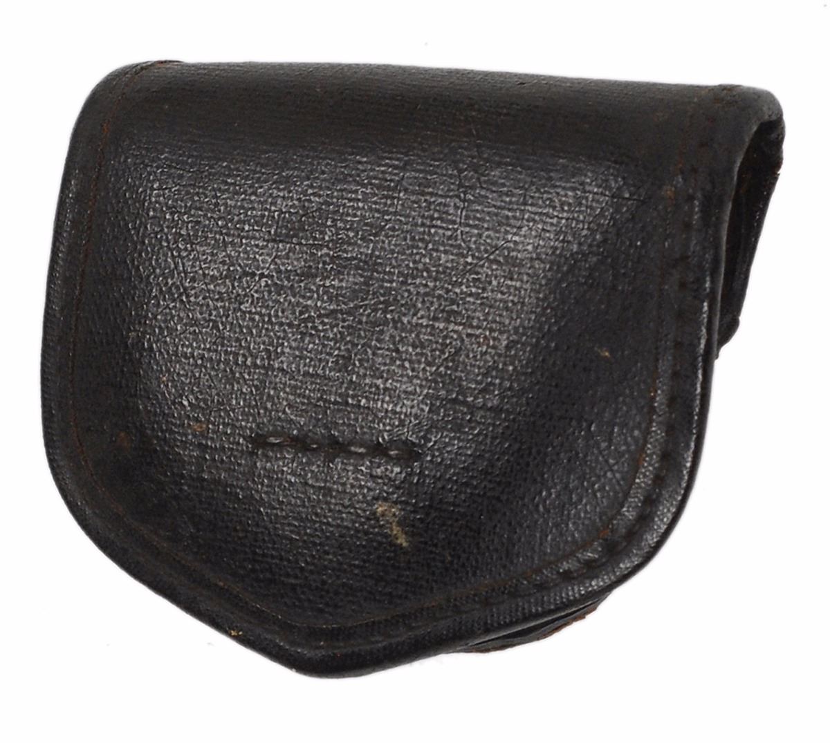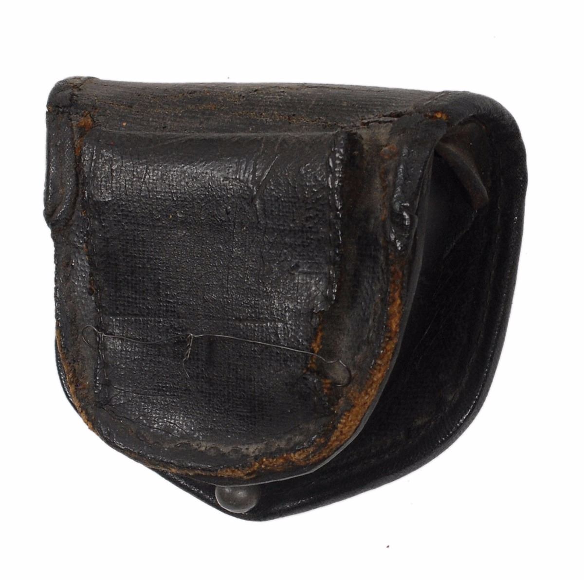 Confederate painted cloth percussion cap box produced in Columbus, Georgia, for use by the Confederate military forces during the Civil War, measuring approximately 4 x 3.5 x 1.5, with a large stiff cover flap, smaller inner flap, closure finial at the bottom, and a 2.5? wide belt loop. In very good condition, with inner flap detached but held in place by stiff outer flap, wear to edges of the back and belt loop, and closure tab detached and absent. This exact piece is depicted in the Arms and Equipment of the Confederacy volume of Time Life’s Echoes of Glory reference book set.