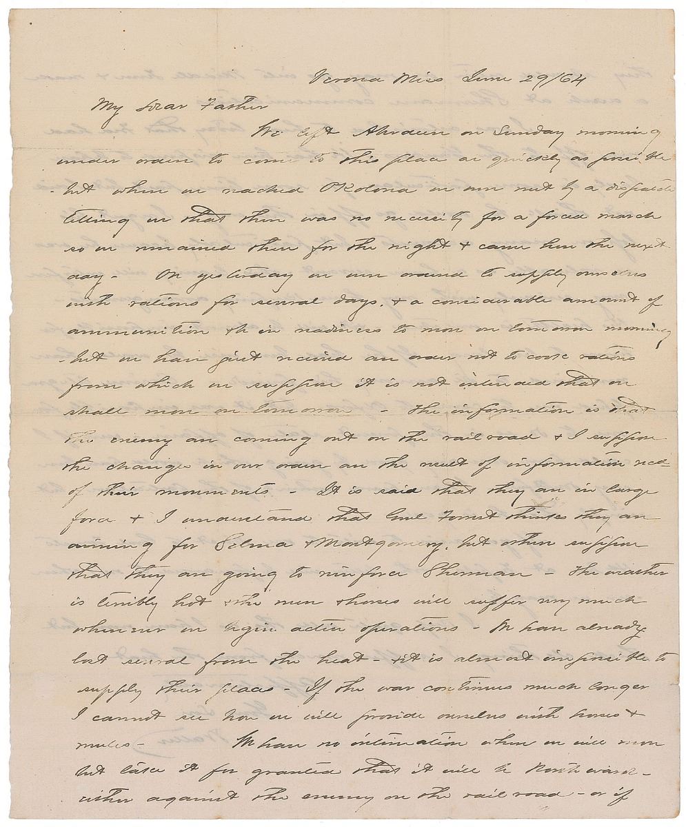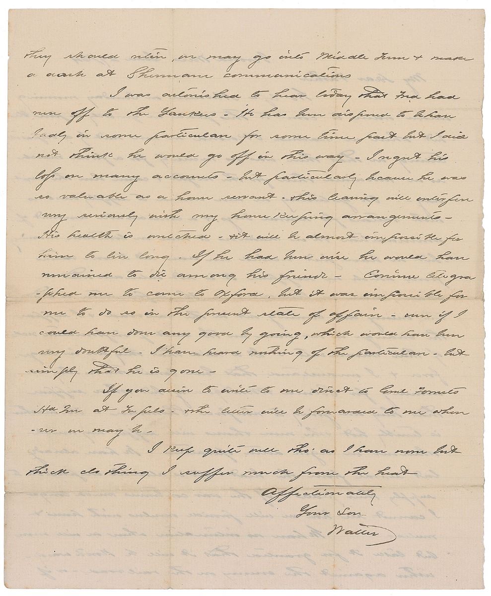 Confederate captain who was staff officer to General James Chalmers and delivered Nathan Bedford Forrest’s demand for the surrender of the Union garrison at Ft. Pillow. War-dated ALS signed “Walter,” one page both sides, 8.25 x 10, June 29, 1864. Letter to his father. In part: “The information is that the enemy are coming out on the railroad…I understand that Genl. Forrest thinks they are aiming for Selma & Montgomery, but I suppose that they are going to reinforce Sherman…If the war continues much longer I cannot see how we will provide ourselves with horses & mules…We may go into Middle Tennessee & make a dash at Sherman’s communications. I was astonished to hear today that Fred had run off to the Yankees—he has been disposed to behave badly in some particular for some time past but I did not think he would go off in this way. I regret his loss on many accounts—but particularly because he was so valuable as a house servant & his running will interfere very seriously with my housekeeping arrangements…If you desire to write to me direct to Genl. Forrest’s Head Quarters at Tupelo—& the letter will be forwarded to me wherever we may be.” In fine condition, with intersecting folds.