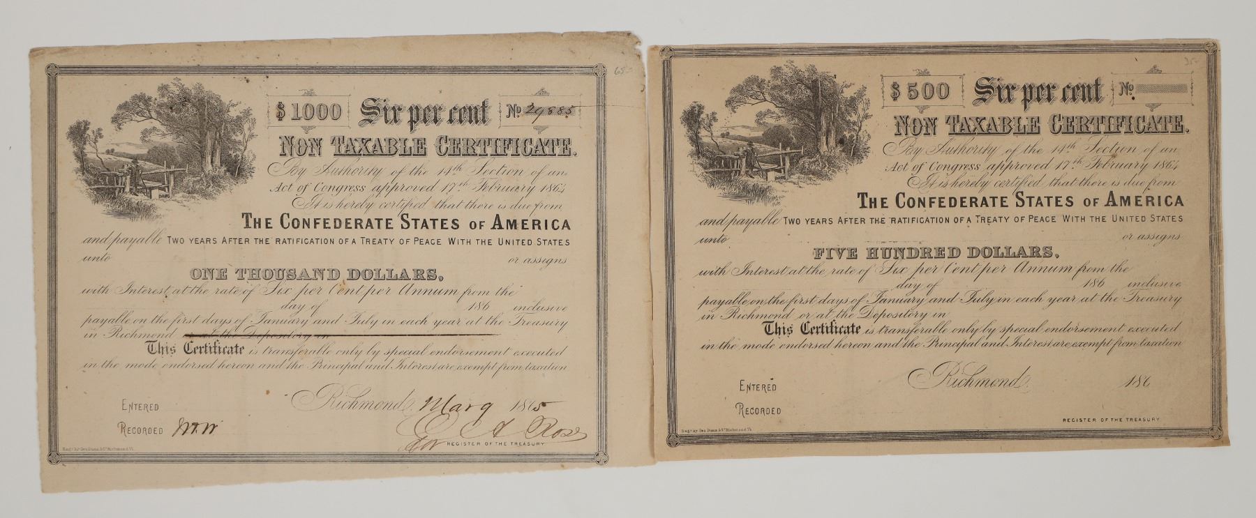 Lot of 2. One $500 (U/U) and one $1000 (I/U), 6%, Non-Taxable Certificate Treaty of Peace With The United States. . $1000 issued 1865, signed by C.A. Rose Treasurer. Very rare in any condition. VF condition.