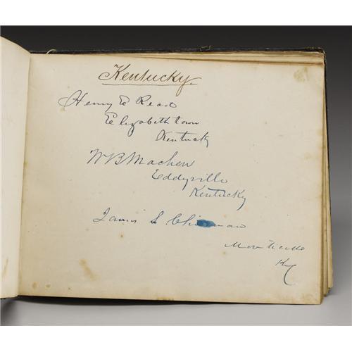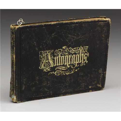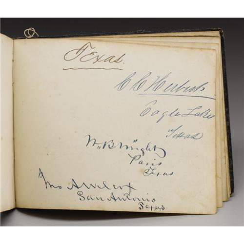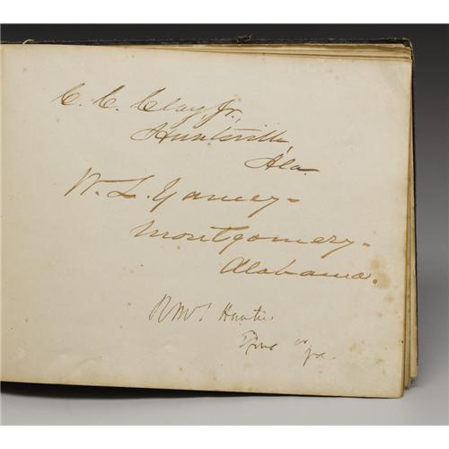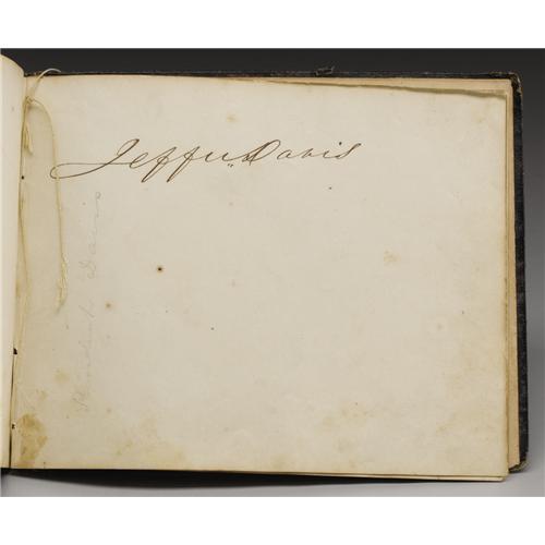 <B>First Confederate Congress Autograph Book With 135 Signatures,</B></I> over 100 pages, 8" x 6.5", with gold tooled leather cover. This excessively rare and nearly complete collection of Confederate political autographs was probably compiled by a Miss Clara M. Cannon of Torrey Creek, South Carolina. Her name appears twice within the book, both in pencil and in pen. Given the death dates of some of the signatories, this collection must have been assembled between February 18 and October 13, 1862. The book has three distinct sections: The first consists of Confederate senators' autographs; the second is devoted to Confederate representatives' autographs and is collected alphabetically by state. Included are Alabama, Arkansas, Georgia, Florida, Kentucky, Louisiana, Mississippi, Missouri, North Carolina, South Carolina, Tennessee, Texas and Virginia; the third contains signatures of Confederate politicians, cabinet members and functionaries. Among these are Jefferson Davis, Judah P. Benjamin, George W. Randolph, Stephen Mallory and Samuel Cooper. (Alexander Stephens is not included.) Covers worn and binding somewhat loose. Light aging and internally fine.<BR><BR><b>Shipping:</b> Books & Catalogs (<a target="_blank" href="http://www.heritageauctions.com/common/shipping.php">view shipping information</a>)