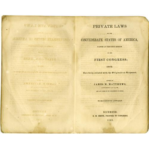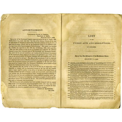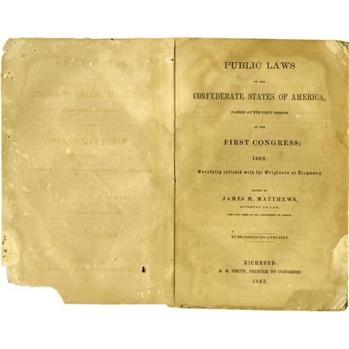 <B>Confederate Congressional Imprint,</B></I> "Public Laws of the Confederate States of America, Passed at the First Session of the First Congress"; 1862, 65 pages, 6.25" x 9.75", Richmond, Virginia. Plain paper wraps, the whole tied with string. Moderate browning throughout, some stains on outer sheets. Overall good condition. A rare compilation recording the initial activity of the Confederate Congress. Among the first business attended to was that the establishment of salaries for elected officials. Other measures of note define the nature of the new Confederate Government, including one allowing the president to suspend the writ of <I>habeas corpus</B></I> as needed.<BR><BR><b>Shipping:</b> Books & Catalogs (<a target="_blank" href="http://www.heritageauctions.com/common/shipping.php">view shipping information</a>)