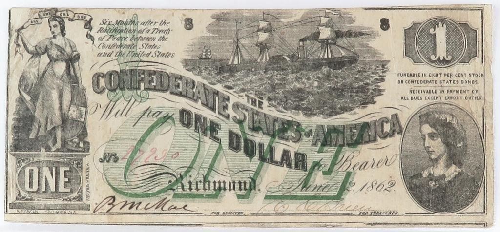 Confederate Currency: June 6, 1862 $1 Confederate States of America - T-45.