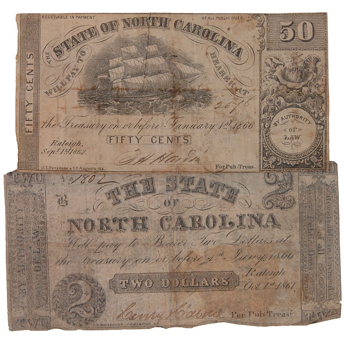 Two Confederate banknotes: state of North Carolina two-dollar bill printed on the reverse of un-issued North Carolinian four-dollar currency, number 1802, issued on October 1, 1861; and a state of North Carolina fifty-cent bill, number 2576, issued on September 1, 1862, featuring a vignette of a ship. Overall creases and soiling, otherwise very good condition. Accompanied by a replica Confederate States of America one-cent coin and a replica anti-Jefferson Davis token, as well as an original circa 1890s Sweet Caporal pinback button honoring Kentucky.