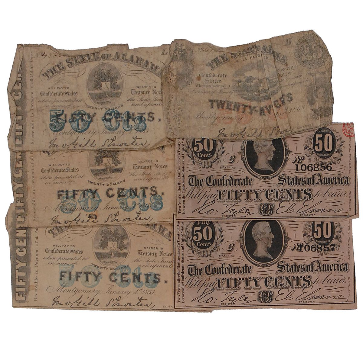Six pieces of Confederate paper currency, four from Alabama and two from the federal government. The four from Alabama are three 50-cent and one 25-cent , all with the printed signature of governor John Gill Shorter; the federal pieces are both Series 1 50-cent sixth issue notes, both dated February 17, 1864, and featuring a bust portrait of Jefferson Davis, and no red stamps. Fifty-cent notes rate fine condition, with light creasing and wear; Alabama notes rate good to very good with one having a partial tear, and others creased and faded.