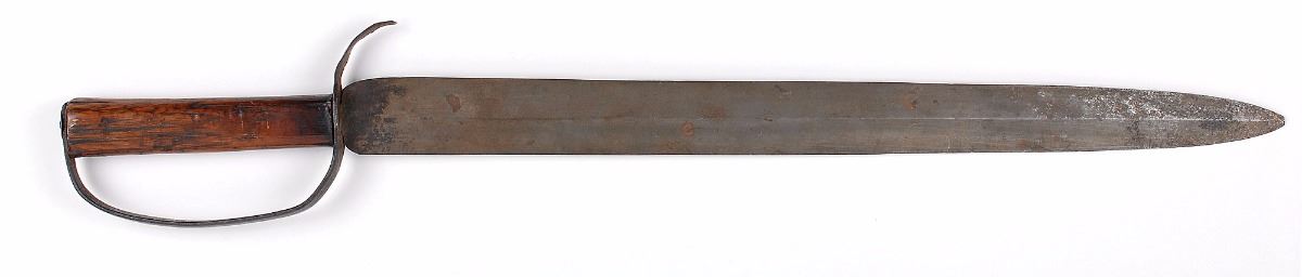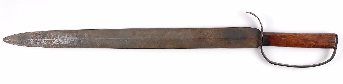 Unmarked Confederate ‘D’ Guard Bowie knife measuring 24.5? in overall length with a 19? double-edged blade with a spear point. The hilt has a dark wood grip that appears to be walnut and an iron ‘D’ shaped guard with a forward curving quillon. The guard itself is dark with age and has fine pitting, and the grip shows some smoothed over fine splinters with a couple of short age cracks near the blade; overall it is sound and in good condition. The sharp blade has a dark gray patina and has no nicks with the tip slightly blunted, and exhibits some faint pitting at the tip and light pitting at the guard. In general the knife shows its age and use but has not been abused. This type of unmarked Bowie knife is typical of the local blacksmith-made knives popular among Southerners at the war’s beginning. Although these Bowie ‘sidekicks’ were made by the thousands early on, many were later thrown away by rebel soldiers who did not want to carry the extra weight and thus today are scarce Civil War collectibles.
