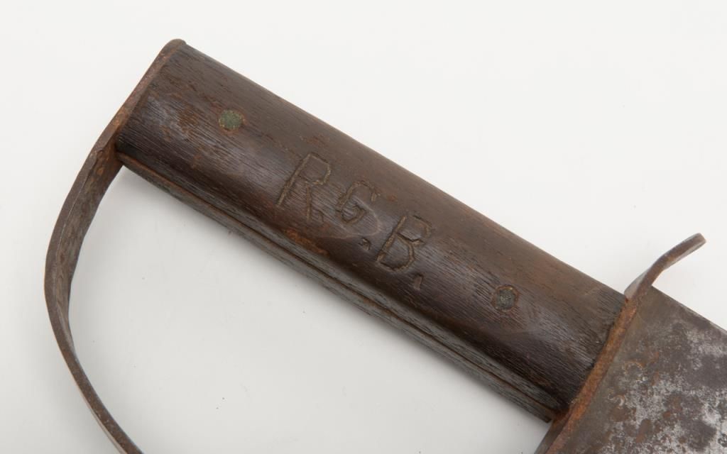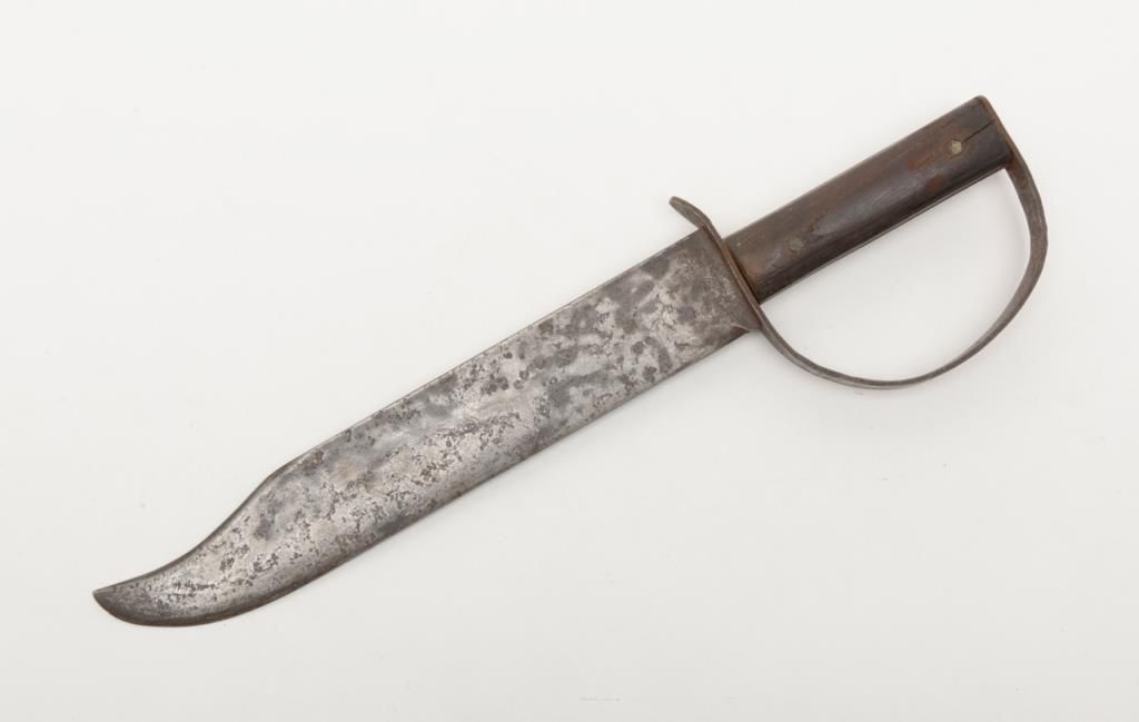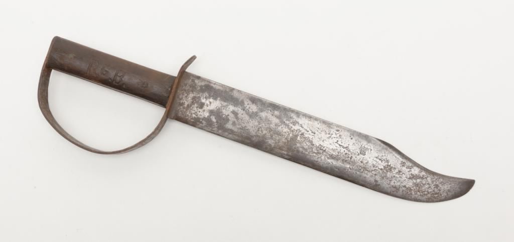 Confederate D guard Bowie knife stamped “CS” near rear portion of the blade on the right side near the hilt. The blade measures 12 ¼” and the knife is 17 and nearly ¾” overall. The right grip is carved with the initials R. B. With a small Gcarved in the center. The inventory card from Bill Gary collection indicates this knife was carried during the Civil War by J. R. Bass private in 2nd Alabama Cavalry. J.R. Bass was Mr. Gary’s great-grandfather. “The knife was given to me when I was a young boy by Mrs. H.R. Royce” and he traces the dissent directly to Bass. The blade shows a clip point with a re-curved tip and is in good condition showing some light to heavy scattered pitting. The guard shows similar lightto heavy pitting and matching patina. The grips are simple hard wood also with a good patina on the grip pins. No doubt to the authenticity as it has never been out of the Gary and Bass family. The William A. Gary collection consigned by hisestate with original inventory card included which is signed by Bill Gary. Est.:$2500-$5000