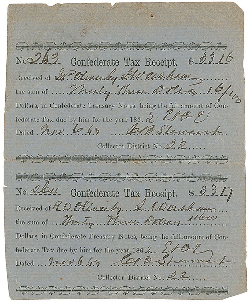 War-dated Confederate tax receipt, 4.5 x 5.5, Receipt bears two to the page, the first, No. 263 in the amount of $33.16, dated November 6, 1862, and the second, No. 264 in the amount of $33.17, dated November 6, 1862. In very good condition, with a uniform strip of toning along the top edge, scattered light toning, light creasing, mild corner creasing, and two dings to the top edge.