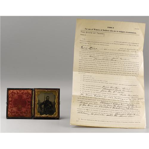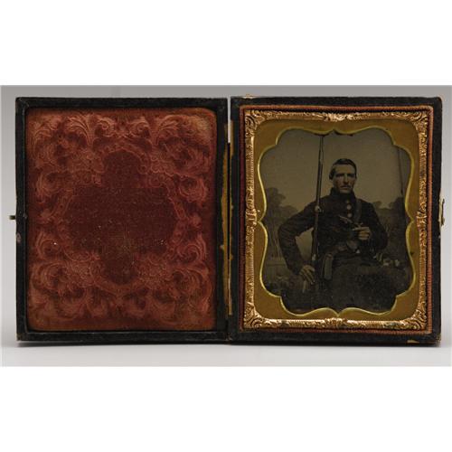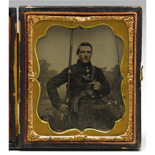 <B>Confederate Double-Armed Soldier 1/6th Plate Ambrotype.</B></I> This seated volunteer shoulders what appears to be a .69 caliber Model 1842 musket and, for action at close quarters, he holds a pocket revolver. He's also outfitted with a cap box, socket bayonet and cartridge box. The soldier's uniform is of a dark gray and has a single row of buttons, which might be Confederate infantry issue with a block "I" on the face. The subject's face and hands are lightly tinted. Houses in a leatherette case from which the lid has separated. Overall very good condition. This image came out of a Texas estate and is accompanied by a partially printed State of Texas Confederate widow's pension application that was never completed. A soldier who dies in 1875 - James Verdren Sams - is named and it is claimed that he was a member of the Beaufort (South Carolina) Volunteer Artillery from 1862 through 1865. Either this image is of Sams before he joined an artillery company or is of a relative.<BR><BR><b>Shipping:</b> Small Collectibles (<a target="_blank" href="http://www.heritageauctions.com/common/shipping.php">view shipping information</a>)
