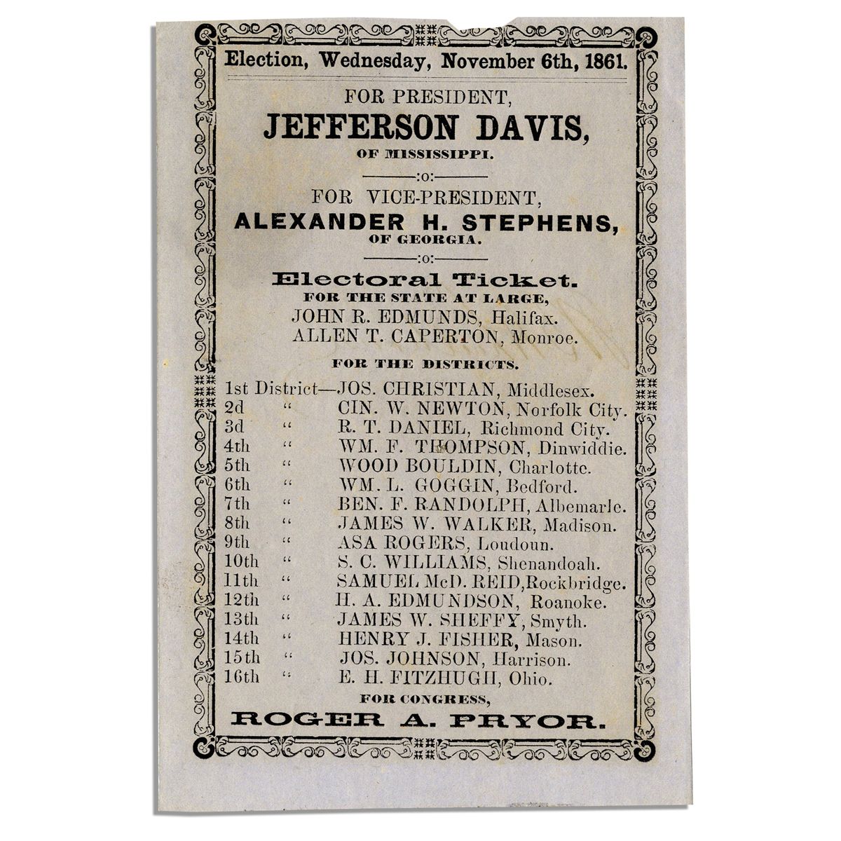 Jefferson Davis Virginia ballot from the 1861 Confederate presidential election. The printed slip reads: ''Election, Wednesday, November 6th, 1861 / For President / Jefferson Davis / of Mississippi / For Vice President / Alexander H. Stephens / of Georgia / Electoral Ticket / For The State At Large...'' Davis had been a Senator for Mississippi the year before, and ran without opposition for the Confederate presidency. The slip lists candidates for the 1st through 16th districts in Virginia, and nominates Roger A. Pryor for Congress. A signature to verso is that of the voter who cast this ballot. Measures 4'' x 6''. Toning and a sliver of paper loss to the top edge right of center, else near fine.