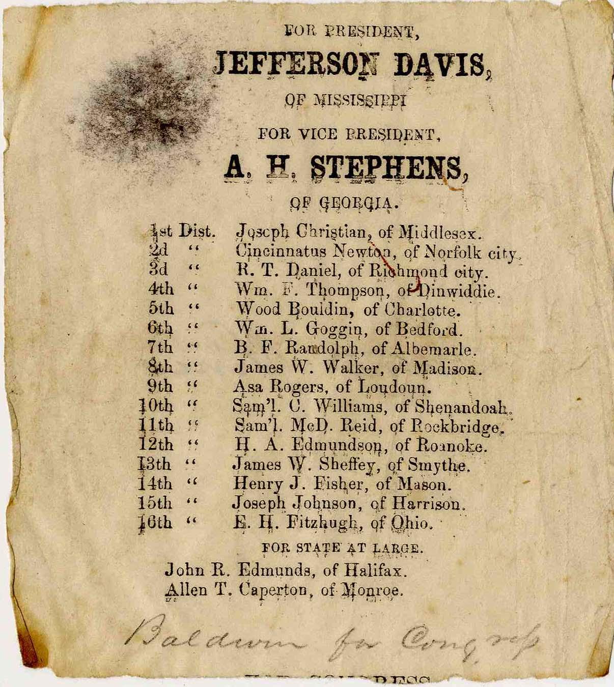 Confederate States of America campaign document listing the roster of candidates for the 18 February 1861 Presidential election. At the top of the ticket is Jefferson Davis for President and A.H. Stephens for Vice President, both of whom won without opposition. Document, measuring 4'' x 5'', is worn, with a dark circle of discoloration at top, but intact and entirely legible. Good condition.