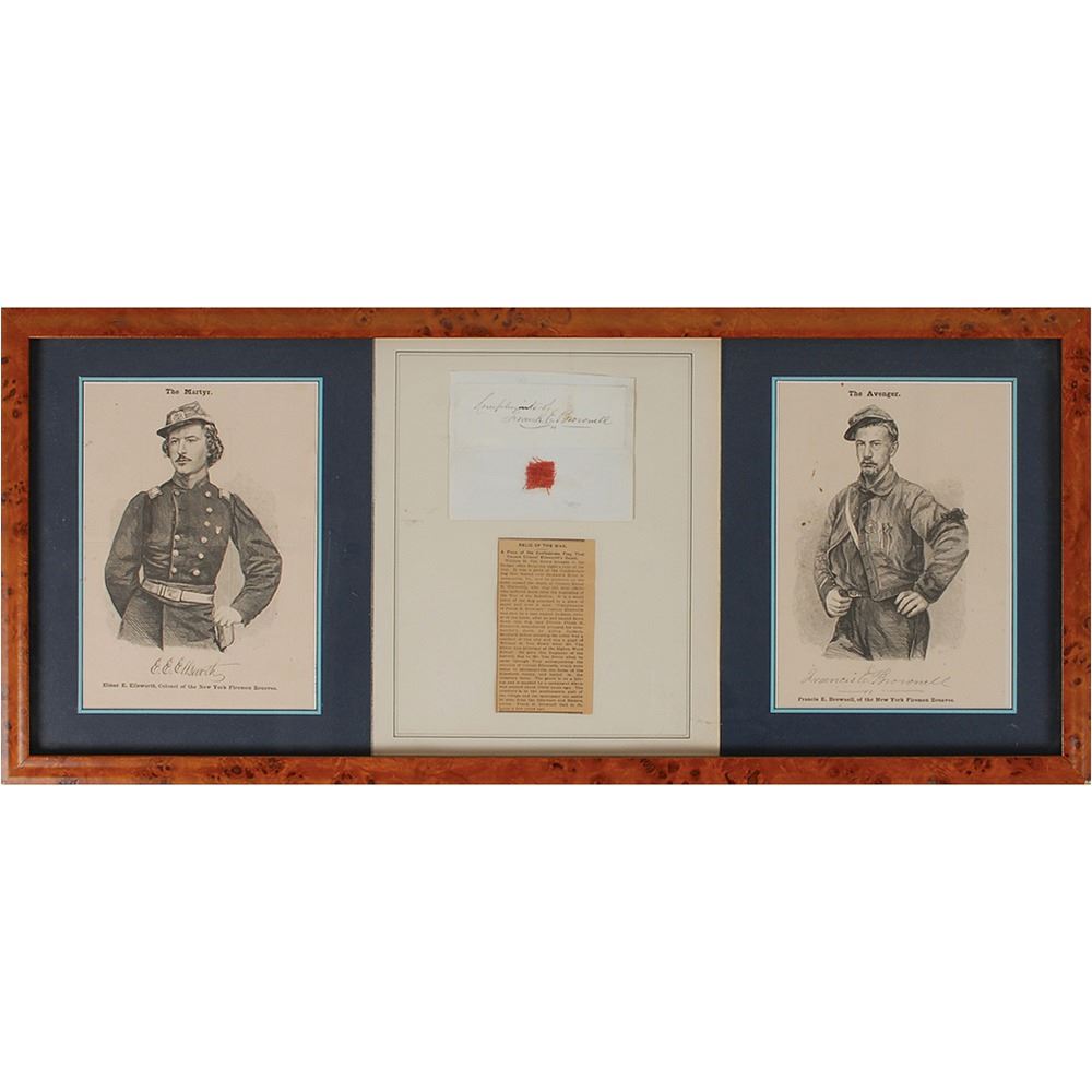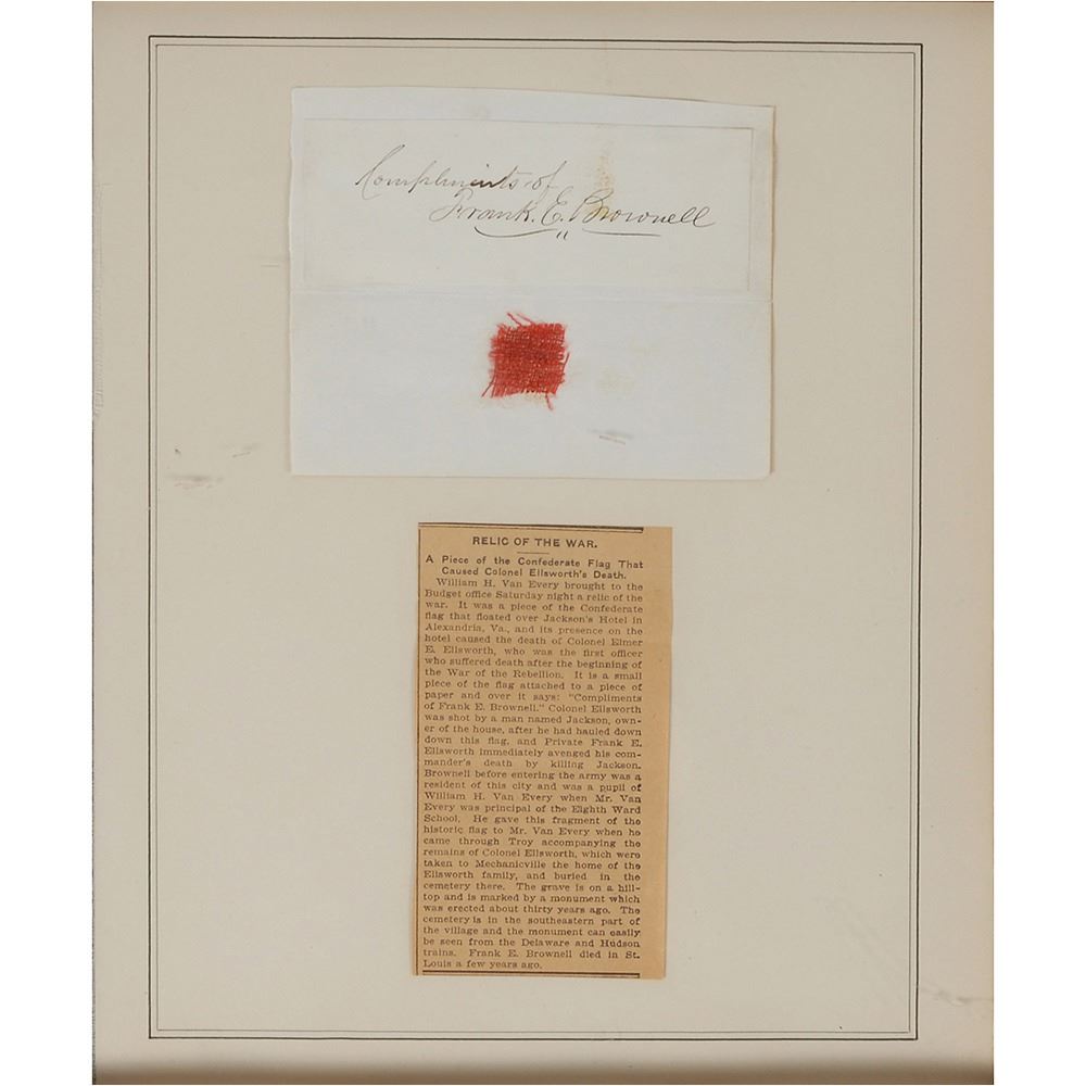 Historically significant red swatch of the Confederate flag removed from the Marshall House by Col. Elmer E. Ellsworth during the Union's advance on Alexandria, Virginia, on May 24, 1861. The swatch measures approximately .75 x .75 and is affixed to a sheet along with an ink signature of one of Ellsworth's men, "Compliments of Frank E. Brownell," who avenged his death that day. Includes a newspaper clipping from the late 1890s describing the relic as having been given by Brownell to William H. Van Every, one of his former school teachers. Nicely mounted, matted, and framed along with portraits of Ellsworth and Brownell to an overall size of 29.5 x 13. In fine condition.
