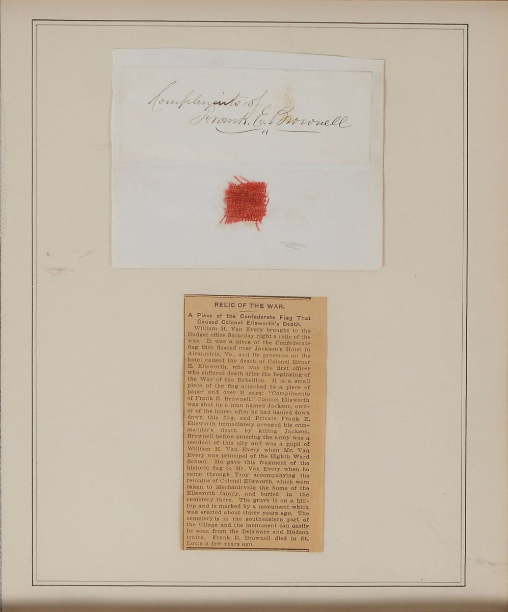 Historically significant red swatch of the Confederate flag removed from the Marshall House by Col. Elmer E. Ellsworth during the Union’s advance on Alexandria, Virginia, on May 24, 1861. The swatch measures approximately .75 x .75 and is affixed to a sheet along with an ink signature of one of Ellsworth’s men, “Compliments of Frank E. Brownell,” who avenged his death that day. Includes a newspaper clipping from the late 1890s describing the relic as having been given by Brownell to William H. Van Every, one of his former schoolteachers. Nicely mounted, matted, and framed along with portraits of Ellsworth and Brownell to an overall size of 29.5 x 13. In fine condition.