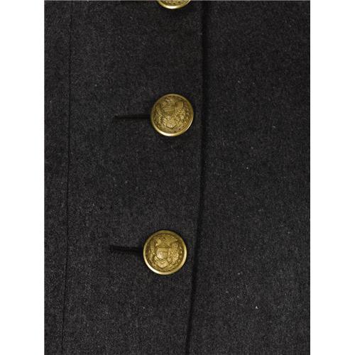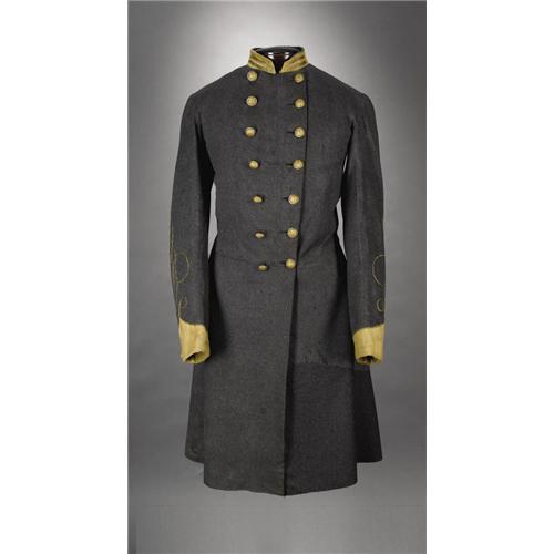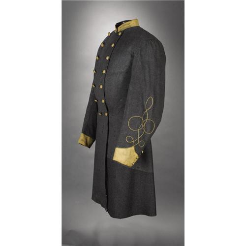 <B>Confederate Frock Coat of Lt. William Allen Hanger, 1st Virginia Cavalry</B></I> Regulation cadet gray wool broadcloth with yellow cuff and collar trim. The sleeves have a lieutenant's single quatrefoil braid and two collar bars. The coat's double-breasted front has 14 Federal eagle staff buttons, four others are on the tail and three similar cuff buttons are on each sleeve. Repaired moth damage throughout, with the lower portion of the left tail being completely replaced. Note that a bullet hole on the right sleeve has been filled. Interior brown cotton lining has been left substantially as is with all of the loss and separations typically associated with aged fabric. An attractive Confederate junior officer's uniform steeped in history.<BR><BR>Lieutenant Hanger (1831 - 1889) was an Augusta County overseer when he enlisted as 1st Sergeant in the Valley Rangers, Co. āEā, 1st Virginia Cavalry. He was appointed 2nd Lieutenant on July 1, 1861 and 1st Lieutenant on April 23, 1862. The previous day, April 22, found Hanger participating in J.E.B. Stuart's raid on Catlett Station, Virginia. During the charge, led personally by J. E.B.Stuart, Hanger was shot in the right arm. The wound never fully healed and the Lieutenant found himself relegated to the Invalid Corps. He was later captured at Cedar Creek on October 19, 1864, Hanger was exchanged and finally paroled on May 19, 1865.<BR><BR><B>Authentication:</B></I> With four-page letter of authenticity and thorough technical analysis by Les Jensen.<BR><BR> <B>Provenance:</B></I> <I>The Tharpe Collection of American Military History</B></I><BR> <BR><B>Exhibited:</B></I> <I>The Liberty Heritage Society Museum</B></I><BR><BR><b>Shipping:</b> Requires 3rd Party Shipping (<a target="_blank" href="http://www.heritageauctions.com/common/shipping.php">view shipping information</a>)