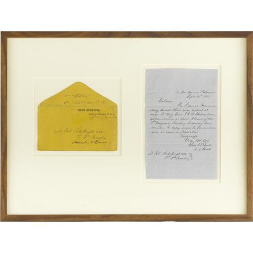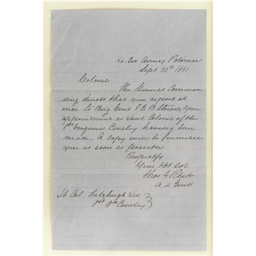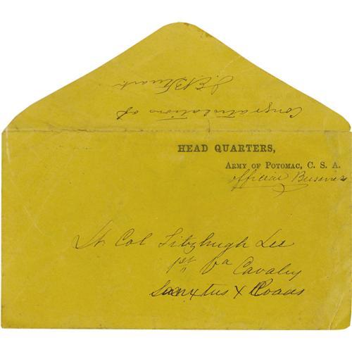 <B>Confederate General JEB Stuart's Handwritten Notes to Fitzhugh Lee.</B></I> This important document, handwritten by Confederate General JEB Stuart and addressed to Fitzhugh Lee, details Stuart's congratulatory remarks as Lee is promoted through the ranks of the Confederate army. Nephew of Robert E. Lee and 1856 West Point graduate , Lee had already served on the frontier suffering a near-disabling wound by an Indian arrow when he resigned his commission in the United States Army to serve his native Virginia in the Civil War. After his meritorious service under General Joseph Johnston, Lee was promoted to Lieutenant Colonel of the First Virginia Cavalry led by the heroic General James Ewell Brown (JEB) Stuart. Upon receiving the appointment by Virginia Governor John Letcher, the Confederate Secretary of War assigned Lee to Stuart's First Virginia Cavalry. After receiving the letter of Lee's assignment, Stuart penned "<I>congratulations of JEB Stuart</B></I>" on the back flap of the envelope and forwarded it to Lee. The envelope and Stuart's handwriting are in very good condition. The envelope measures 5.75" x 5" (opened for display of the Stuart handwritten note). The front of the envelope bears the printed words, "Head Quarters" and "Army of the Potomac, C.S.A." in block letters. The envelope is hand-addressed to "<I>Lt. Colonel Fitzhugh Lee 1st Va. Cavalry</B></I>".<BR><BR>The handwritten letter measures 5.25" x 8.25" and is on blue, lined paper. The letter is written by General Joseph E. Johnston's assistant adjutant Major Thomas Grimke Rhett. Johnston was commander of the Army of the Potomac at the time. Major Rhett had an admirable career of his own before and after the war. A graduate of West Point, Class of 1845, he was brevetted for valor in the Mexican War. A native South Carolinian, he had risen to the rank of Major in the US Army at the time of the war. Resigning his commission to join the Confederacy, Rhett served as Johnston's assistant adjutant and then went on to the Trans-Mississippi Department. After the war, Rhett accepted a military commission in the Egyptian Army serving as a colonel until falling ill and dying from natural causes. Dated September 30, 1861, his letter to Lee reads, "<I>Colonel, The General commanding directs that you report at once to Brig. Genl J. E. B. Stuart your appointment as Lieut. Colonel of the 1st Virginia Cavalry having been made, A copy will be furnished you as soon as possible. Respectfully Your abt sol Thos G Rhett A. Genl.</B></I>" This is a snapshot of an historical moment in the Civil War - a promotion of a member of the Lee family to Brigadier General and a hand written note from one of the South's greatest heroes, JEB Stuart. As a bonus, the handwritten letter from Major Rhett completes this set.<BR><BR><b>Shipping:</b> Framed (<a target="_blank" href="http://www.heritageauctions.com/common/shipping.php">view shipping information</a>)