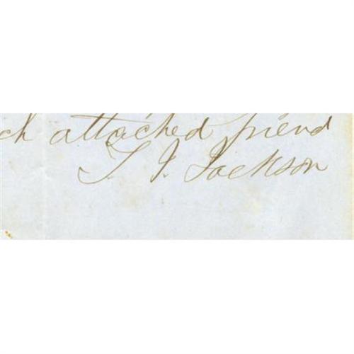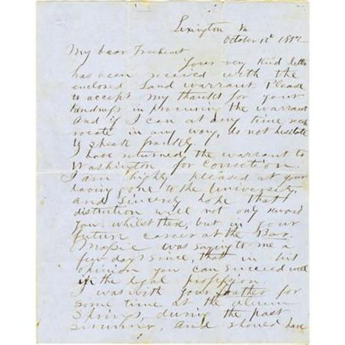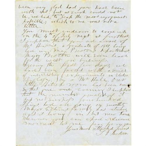 <B>Confederate General Thomas "Stonewall" Jackson Autograph Letter Signed</B></I> "<I>T. J. Jackson</B></I>". Two pages, bifolia, light blue plain paper, 7.75" x 9.75", Lexington, Virginia, October 12, 1852, to "<I>My Dear Truheart</B></I>", ink. Includes engraving of Jackson from an original Nast painting. Jackson was a Confederate Civil War general, one of the most revered southern generals after General Lee. His letter here reads, in full: "<I> Lexington, Va October 12 1852 My dear Truheart: Your very kind letter has been received with the enclosed Land warrant. Please to accept my thanks for your kindness in procuring the warrant and if I can at any time reciprocate in any way, do not hesitate to speak frankly. I have returned the warrant to Washington for correction. I am highly pleased at your having gone to the University, and sincerely hope that distinction will not only reward you whilst there, but in your future career at the Bar. Massie was saying to me a few days since, that in his opinion you can succeed well in the legal profession. I was with your father for some time at the Alum Springs during the past summer, and should have been very glad had you been with us; but as such could not be, we had alone to reap the most enjoyment possible, which to me was not a little. You must endeavor to come up on the 4th of July next at farthest. I suppose that you are aware of Mr. Harris a graduate of 1851 being here in Maj. Prestons Department. Major Preston will soon leave for the west on business. During the past few days, we have been favored with a series of interesting experiments in Electro-Byology by a Mr. Hale. Our little Lecture room has been crowded so that one evening I suppose that the number equaled, if it did not surpass four hundred. Things here are going smoothly. Major Gilhelms family has returned and is living in his new house. When ever you can spare a leisure moment, let me hear from you. Your much attached friend, T. J. Jackson</B></I>". Usual vertical and horizontal folds, and mild edge wear, else fine. An intimate and friendly pre-Civil War letter from one of the most gifted tactical commanders in military history.<BR><BR><b>Shipping:</b> Flat Material, Small (<a target="_blank" href="http://www.heritageauctions.com/common/shipping.php">view shipping information</a>)