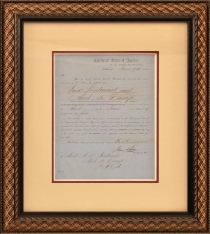 Appointment of A.J. Toutant as 1st Lieutenant and Aide de Camp to General Beauregard. Signed by James Seddon. Framed 16" x 18"