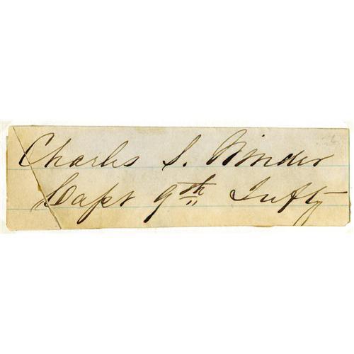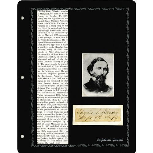 <B>Confederate General Charles S. Winder, Commander of the "Stonewall Brigade": A Scarce Signature.</B></I> A fine, clean clipped signature with his then-rank of <I>"Capt. 9th Inft."</B></I> in the U.S. Army. He was promoted to captain on March 3, 1855, and at 26 this West Point graduate was the youngest captain in the army. By March, 1862 he rose to a Brigadier General and was placed in command of what would later be known as the "Stonewall Brigade". In the run-up to Second Manassas he commanded Jackson's division (Jackson himself commanded the corps), and was killed by an artillery shell at Cedar Mountain on October 9, 1862. His loss was lamented by both Lee and Jackson in their reports.<BR><BR><b>Shipping:</b> Small Flat (<a target="_blank" href="http://www.heritageauctions.com/common/shipping.php">view shipping information</a>)