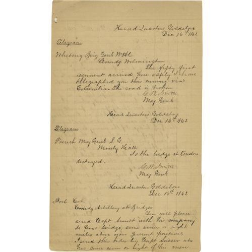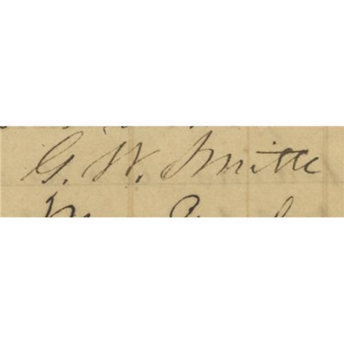 <B>Confederate General Gustavus Woodson Smith, December 16, 1862 Document Signed Three Times.</B></I> <I>"G. W. Smith."</B></I> One page, 7.25" x 11.75", Goldsboro, North Carolina, December 16, 1862, ink. The document presented here is a series of short dispatches and telegrams written in a secretarial hand on both sides of one page, with three of the messages signed "<I>G. W. Smith</B></I>" at the end. The document is dated December 16, 1862, and written from Goldsboro, North Carolina, where G. W. Smith was commander of the defenses of the North Carolina coastline at the time. Interestingly, Smith resigned his commission shortly thereafter because he was passed over for promotion to Lieutenant General. He would later serve with distinction in the Georgia militia until his surrender in 1865 after Sherman's March. The document presented here is very fine, with just one very small hole at the top left of the document. This is a rare triple-signed document from a scarce Confederate General.<BR><BR><b>Shipping:</b> Miscellaneous Collectibles, Smal (<a target="_blank" href="http://www.heritageauctions.com/common/shipping.php">view shipping information</a>)