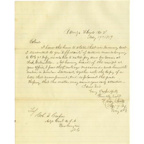 <B>Confederate General Henry Little Autograph Letter Signed.</B></I> A fine 1859 ALS written from Camp Floyd to Colonel Cooper, U.S adjutant general in Washington, with military content. Little (died 1862) is a scarce signature and the Sanders <I>Price Guide to Autographs</B></I> shows no prices for a document or letter.<BR><BR><b>Shipping:</b> Small Flat (<a target="_blank" href="http://www.heritageauctions.com/common/shipping.php">view shipping information</a>)