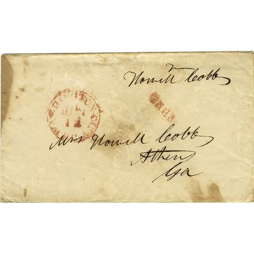 <B>Confederate General Howell Cobb Free Franked Envelope</B></I> signed in the upper right corner and postmarked Washington City D.C. 5.5" x 3.25", addressed to his wife "<I>Mrs. Howell Cobb Athens Ga</B></I>". There is a pencil notation on the back "1846". At this time Cobb was in his second term as a congressman from Georgia. He would later serve as James Buchanan's secretary of the treasury from 1857 until his resignation in 1869 to become a leader in the secessionist movement. During the Civil War, he rose to the rank of major general before surrendering at Macon, Georgia on April 20, 1864. Very good condition with staining and toning.