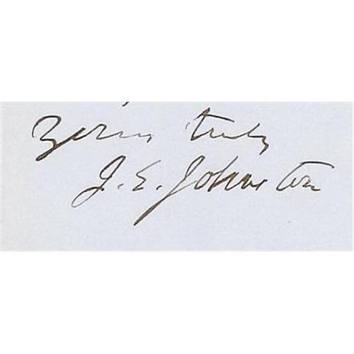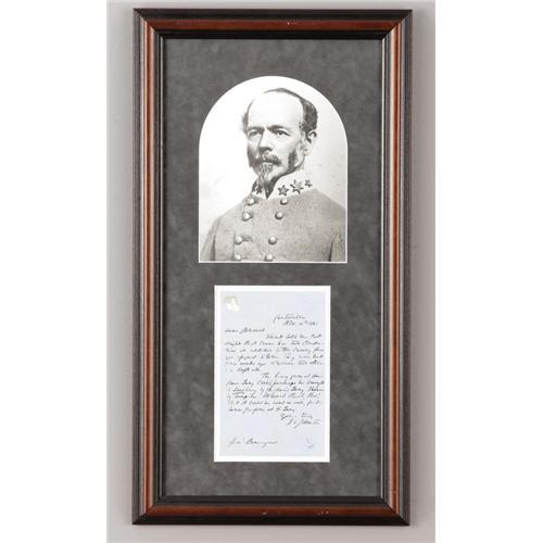 <B>Confederate General J.E. Johnston to P.G.T. Beauregard Autograph Letter Signed <I>"J.E. Johnston"</B></I>,</B></I> one page, 5" x 8", matted and framed under glass (13.5" x 25.5" overall) with print of Johnson, Centerville, Virginia, November 10, 1861, to General P.G.T. Beauregard. It reads: <I>"Dear General, Stuart told me last night that Evans has two companies in addition to the cavalry force you assigned to him. They were sent some weeks ago to relieve two others & E. kept all. The heavy guns at Harper's Ferry could, perhaps be brought to Leesburg by Snicker's Ferry thence by turnpike. I should think this: that it could be used as well, for the same purpose at H. Ferry. Yours truly, J.E. Johnston."</B></I> This important letter is a reference point for four Confederate generals: J.E. Johnston, P.G.T. Beauregard, J.E.B. Stuart, and Richard Ewell. Centerville, Virginia was the winter headquarters for the Confederate Army during the winter of 1861-62. The letter is in fine shape, easily legible and the ink is still bright. There is one small hole in the top left corner.<BR><BR><b>Shipping:</b> Framed (<a target="_blank" href="http://www.heritageauctions.com/common/shipping.php">view shipping information</a>)