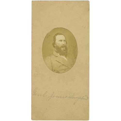 <B>General James Longstreet Salt Print.</B></I> 1.25" x 1.5" oval salt print image mounted to larger 2" x 4.25" card. This rare head-and-shoulders portrait shows General Longstreet wearing a double-breasted grey uniform coat. Penciled ID on lower margin, dealer's penciled notation on verso, light aging as expected with crisp edges. Overall very good condition.<BR><BR><b>Shipping:</b> Small Flat (<a target="_blank" href="http://www.heritageauctions.com/common/shipping.php">view shipping information</a>)