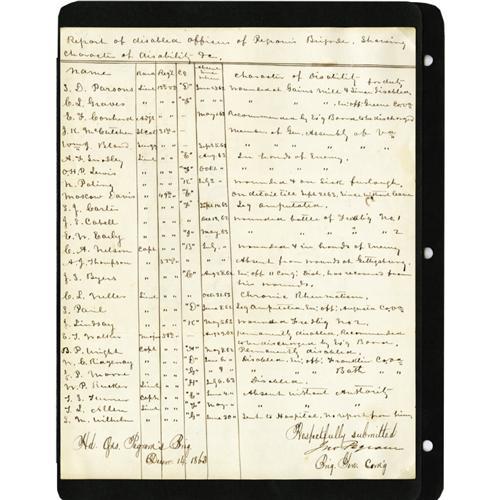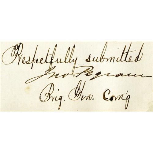 <B>Confederate General John Pegram Report Signed</B></I> "<I>Jn. Pegram</B></I>". One page, 8" x 10", dated December 14, 1863, report of disabled officers of Pegram's Brigade, fine condition. A report indicating not only names, ranks, regiments, companies but characteristics of disabilities - "<I>…In hands of enemy…</B></I>", "<I>…Chronic rheumatism</B></I>", "<I>…Leg amputation</B></I>", "<I>…Absent without authority</B></I>", "<I>…Wounded Gaines Mill & since disabled</B></I>", etc. Pegram was killed at Hatcher's Run on February 6, 1865.<BR><BR><b>Shipping:</b> Small Flat (<a target="_blank" href="http://www.heritageauctions.com/common/shipping.php">view shipping information</a>)