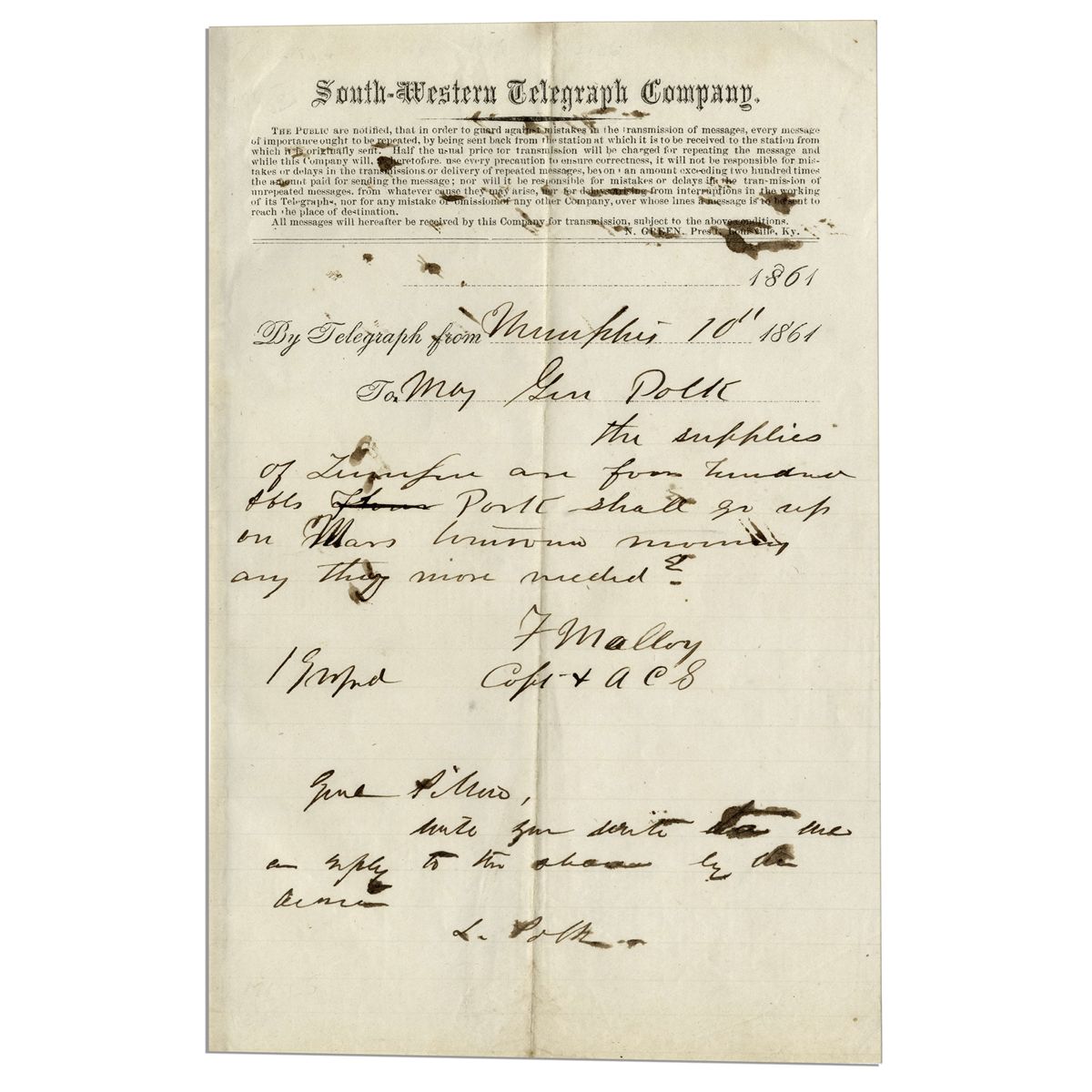 Leonidas Polk autograph note signed, ''L. Polk'' to the bottom of an original telegram he received regarding supplies from a Capt. Mallory from Memphis sometime in 1861. Polk write a short note to General Gideon Pillow, asking him to ''write to me a reply.'' South-Western Telegraph Company telegram measures 5.5'' x 8.5'' with ink smudging throughout and some minor folds and toning. Else very good.