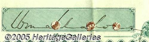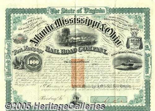 <B>Confederate General Mahone Atlantic, Mississippi and Ohio Railroad Autographed Bond</B></I> General William Mahone (1826-1895), he signs this Atlantic, Mississippi & Ohio Railroad $1,000 gold bond dated 1871, orange imprinted Internal Revenue stamp at center, several rows of interest bearing coupons with an engraving of a steam locomotive. General Mahone was a railroad president, Confederate general, and a Senator from Virginia. General Robert E. Lee said after the war that among the younger men he thought William Mahone had developed the highest quality for organization and command. In railroads after the war, Mahone created the privately owned Atlantic, Mississippi & Ohio Railroad. Of this fine road (later the Norfolk & Western) he was president at a salary (men noted) "as big as the President's". The very finest graphics by Continental Bank Note Co. In the top 10 most beautiful American bonds ever. A great addition to any Southern or Confederate collection. Mahone's signature is hole cancelled but reasonably clear. Includes biographical information. Excellent condition. <I>Accompanied by COA from PSA/DNA.</B></I>
