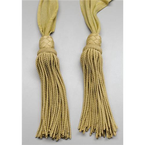 <B>Confederate General Officer's Gold Sash,</B></I> a scarce Confederate general's sash similar to what Lee and Stuart would have worn. With large braided knots and twisted fringe and a white gold silk bodice. This would have completed a general officer's uniform ensemble. <BR><BR><b>Shipping:</b> Clothing & Costumes (<a target="_blank" href="http://www.heritageauctions.com/common/shipping.php">view shipping information</a>)