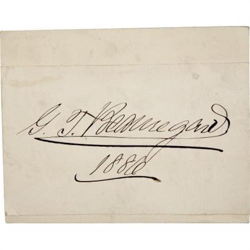 <B>Confederate General Pierre Gustave Toutant de Beauregard Signature</B></I> “<I>G. T. Beauregard 1886</B></I>”. 5” x 2.75”, clipped from a document or letter and mounted on a stiff backing piece, soiled, lower left corner bent but present, mounting remnants on the verso, else a bold signature in near fine condition. P.G.T. Beauregard, known as “The Little Creole”, was a successful Confederate general, instrumental in winning the First Battle of Bull Run. After the war Beauregard served in numerous civil service positions in his native state of Louisiana. <BR><BR><BR><b>Shipping:</b> Flat Material, Small (<a target="_blank" href="http://www.heritageauctions.com/common/shipping.php">view shipping information</a>)