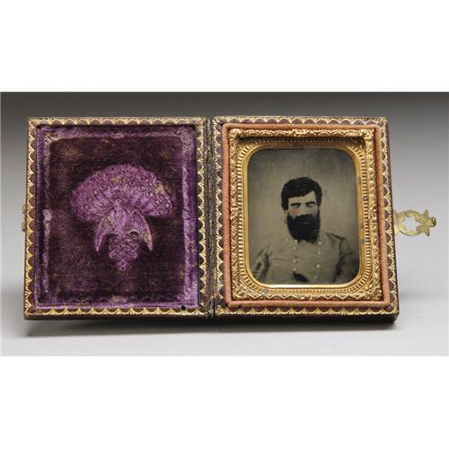 <B>Confederate General Turner Ashby in Death 1/9th Plate Ambrotype.</B></I> A beautiful hand-tinted ambrotype of Turner Ashby (1828-1862), "The Black Knight of the Confederacy," probably taken June 7, 1862, in Winchester, Virginia. Ashby was a promising cavalry officer and participated in many engagements in the Shenandoah Valley campaigns while serving under Stonewall Jackson. During an engagement near Harrisonburg, Virginia Ashby was shot through the heart while repelling a Union cavalry attack. This post-mortem photograph of Ashby is his only known wartime image. The image is clear, and you can easily make out the details of Ashby's uniform. It is housed in a beautiful leather case with embossed floral design and gilt decoration. It is complete with ornate gilt brass mat and frame all in fine condition.<BR><BR><b>Shipping:</b> Miscellaneous Collectibles, Smal (<a target="_blank" href="http://www.heritageauctions.com/common/shipping.php">view shipping information</a>)