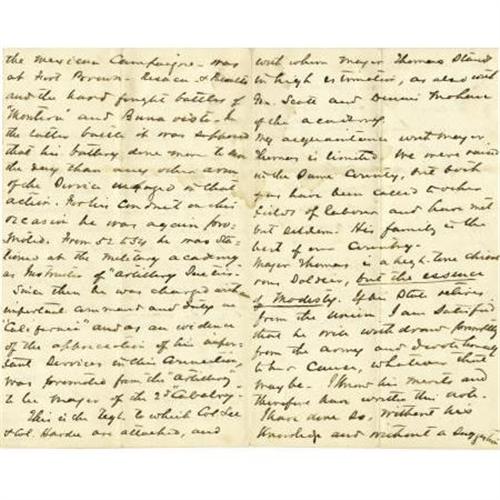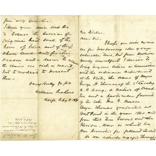 <B>Confederate General William Mahone Autograph Letter Signed</B></I>,<B> </B></I>four pages, 5” x 8”, n.p., February 8, 1861, to Governor John Letcher, probably Richmond, Virginia. This remarkable pre-war letter is a recommendation penned by a future Confederate general on behalf of future Union general's career. The subject of the missive is none other than George H. Thomas, an aristocratic Virginian who would surprisingly eschew the Confederate cause and prove himself one of the Union Army's most valuable generals. Here Mahone suggests that U.S. Army Major Thomas, “<I>the essence of modesty</B></I>”, be offered a post as ordnance officer with Virginia troops. Of Thomas, Mahone erroneously predicts that, “<I>…If our state retires from the Union I am satisfied that he will withdraw formally from the army and devote himself to our cause, whatever that may be…</B></I>” This letter is a great example of history that wasn't. Within three months the two friends would technically be enemies. A few minimal water stains, else fine condition.<BR><BR><b>Shipping:</b> Flat Material, Small (<a target="_blank" href="http://www.heritageauctions.com/common/shipping.php">view shipping information</a>)