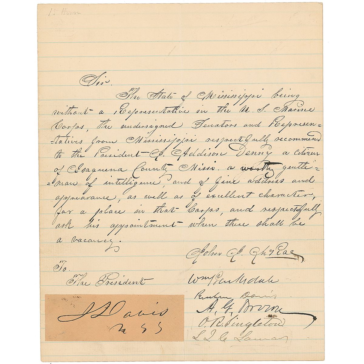 ALS penned by John J. McRae, one page, lightly-lined, 7.75 x 9.75, no date but circa 1860. Letter to “The President,” James Buchanan. In part: “The State of Mississippi being without a Representative in the U. S. Marine Corps, the undersigned Senators and Representatives from Mississippi respectfully recommend to the President G. Addison Denny…a worthy gentleman of intelligence, and of fine address and appearance…for a place in that corps.” Signed at the conclusion by McRae, William Barksdale, Reuben Davis, Albert G. Brown, Otho R. Singleton, and Lucius Q. C. Lamar. An ink signature of Jefferson Davis, “J. Davis, U. S. S.,” on an off-white 3.75 x 1.25 slip was later affixed to the lower left. Intersecting folds with partial edge separations, otherwise fine condition.