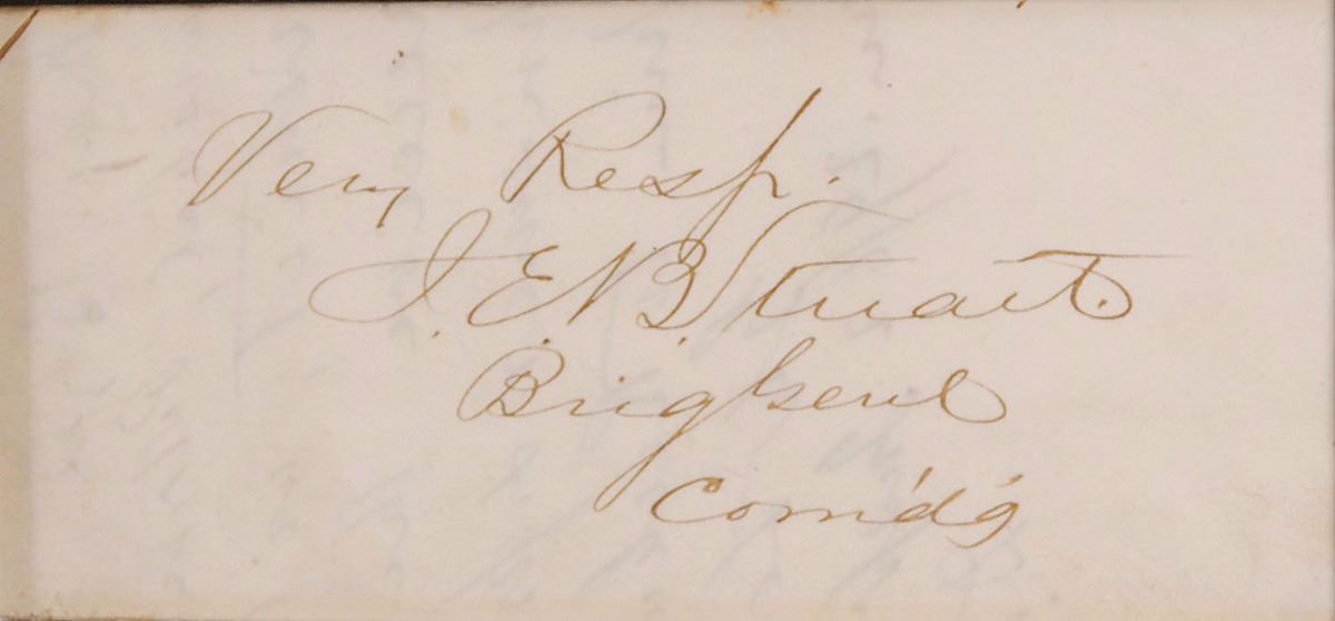Superbly displayed assemblage of three of the most sought-after confederate generals, Robert E. Lee, Stonewall Jackson, and J. E. B. Stuart, including: an ALS signed “R. E. Lee,” one page, April 18, 1869, in full: “Your dispatch rec'd. If my health will permit I will accompany the delegation of the Vally [sic] R. R. Comp'y to Baltimore”; a rare ink signature, “T. J. Jackson, Prof. Nat & Exp. Phil and Instructor of Arty. VMI”; and an ink signature, “Very Resp’y, J. E. B. Stuart, Brig Genl Com'd'g.” Excellently double-cloth-matted and framed with an image and engraved plaque to an overall size of 26.25 x 26.25. Show-through from docketing notations to reverse of the Lee (affecting only the date), show-through from adhesive to the reverse of the Jackson (affecting only his title), and light overall show-through from writing to the reverse of the Stuart. A magnificent display of the revered Confederate generals. Oversized.
