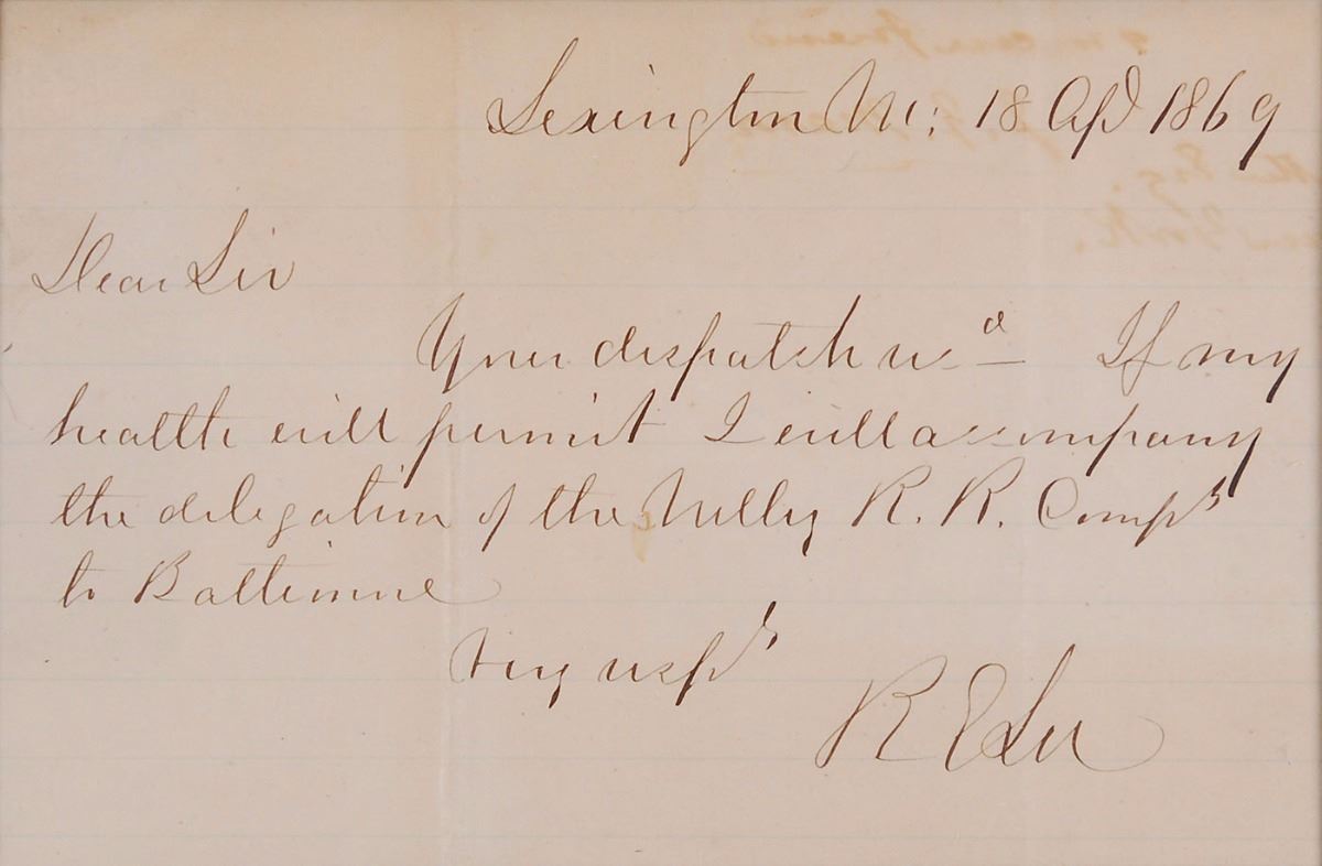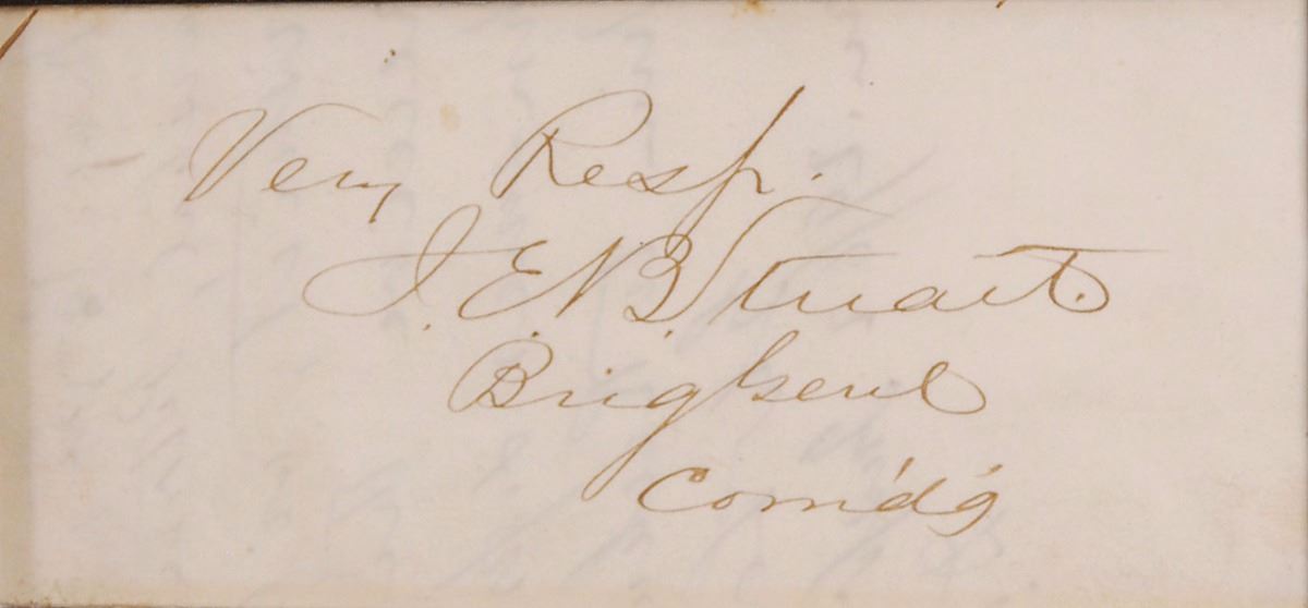 Tremendous assemblage of three of the most sought-after confederate generals, Robert E. Lee, Stonewall Jackson, and J. E. B. Stuart, including: an ALS signed “R. E. Lee,” one page, April 18, 1869, in full: “Your dispatch rec'd. If my health will permit I will accompany the delegation of the Vally [sic] R. R. Comp'y to Baltimore”; a rare ink signature, “T. J. Jackson, Prof. Nat & Exp. Phil and Instructor of Arty. VMI”; and an ink signature, “Very Resp’y, J. E. B. Stuart, Brig Genl Com'd'g.” Excellently double-cloth-matted and framed with an image and engraved plaque to an overall size of 26.25 x 26.25. Show-through from docketing notations to reverse of the Lee (affecting only the date), show-through from adhesive to the reverse of the Jackson (affecting only his title), and light overall show-through from writing to the reverse of the Stuart. A terrific display of the revered Confederate generals.