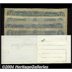 Confederate Group Lot.T66 $50 1864 FineT67 $20 1864 Fine-Very FineT68 $10 1864 VF, nicks and splitsT69 $5 1864 Fine-Very FineTreasurer of the Confederate States blank check About Uncirculated 5 notes <BR><BR><B>Important notice:</B> Heritage usually auctions material at the rate of 200-250 lots per hour. On some occasions eBay Live bid software or the Internet may not be able to keep up with the pace of the auction. We recommend placing a realistic absentee bid now as insurance to avoid disappointment. Occasionally the auctioneer may eliminate or reject an eBay Live bid, and the auctioneer may also reopen a lot after the close of the eBay live bidding (usually because we missed an audience bid), and may reject your bid even if it shows you as the winning bidder. By bidding via eBay Live, you agree that Heritage may award the lot to another bidder at its sole discretion under the circumstances described above or any other reasonable circumstances. Since eBay bids are not shown to us until we open the lot on the floor, we treat those bids just like floor bids. In most cases the floor responds before the eBay bid is presented to us, due to Internet lag time, so for consistency we have made it a policy that floor bids are always considered first over tie eBay live bids. Also please note that all Heritage lots purchased through eBay Live carry a 20% Buyer's Premium. Please make sure you read the Terms and Conditions before you bid. <BR><BR><B>IMPORTANT ANNOUNCEMENT ABOUT RESERVES:</B> Heritage now divulges all reserves on its web site 7 days before every auction. If you want to know whether the reserve on this lot has been met, and if not, what the reserve amount is, please visit this lot page on the HeritageCoin.com web site, or email: bid@HeritageGalleries.com