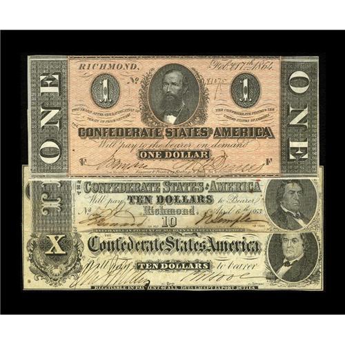 <B>Confederate Grouping including</B></I> T46 $10 1862 bright <B>Fine+;</B></I> T59 $10 <B>CU;</B></I> and T71 $1 <B>Choice CU,</B></I> orange tint.