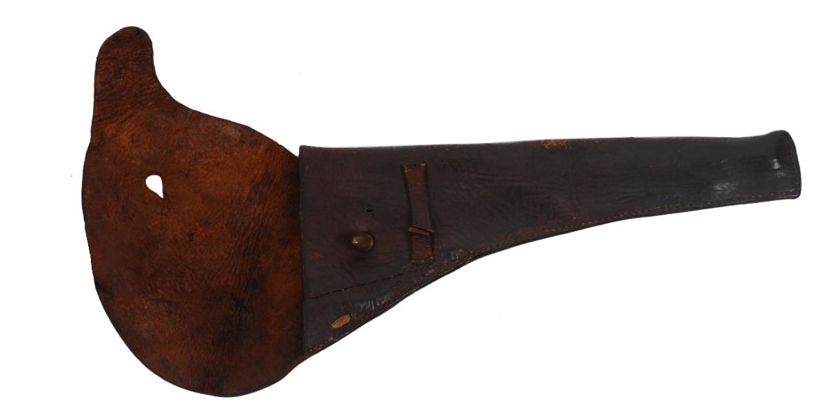 Dark brown leather Confederate holster featuring a flap cut with a small tear at tip, measuring approximately 14? long and 6? at its widest, with a brass pear-shaped finial and light floral design around the finial closure hole. A thin leather strap is sewn beneath the flap to hold it in place, and the belt loop on the reverse measures .75 x 2. All seams are good except a short area near the top with period repair. In very good condition, with scattered crazing, flaking, and wear to leather. Provenance: The Horse Soldier.